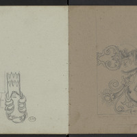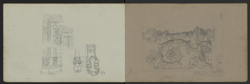Éléments décoratifs de corniche avec plis de serviette et de sculpture à tête de monstre. Guéridon décoratif avec rinceaux et fleurs soutenu par un griffon tenant en son bec un serpent.