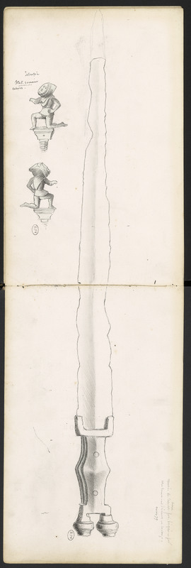 Épée en fer à la poignée à trois épaisseurs liées par deux rivets , au pommeau à antennes en tampon en bronze.