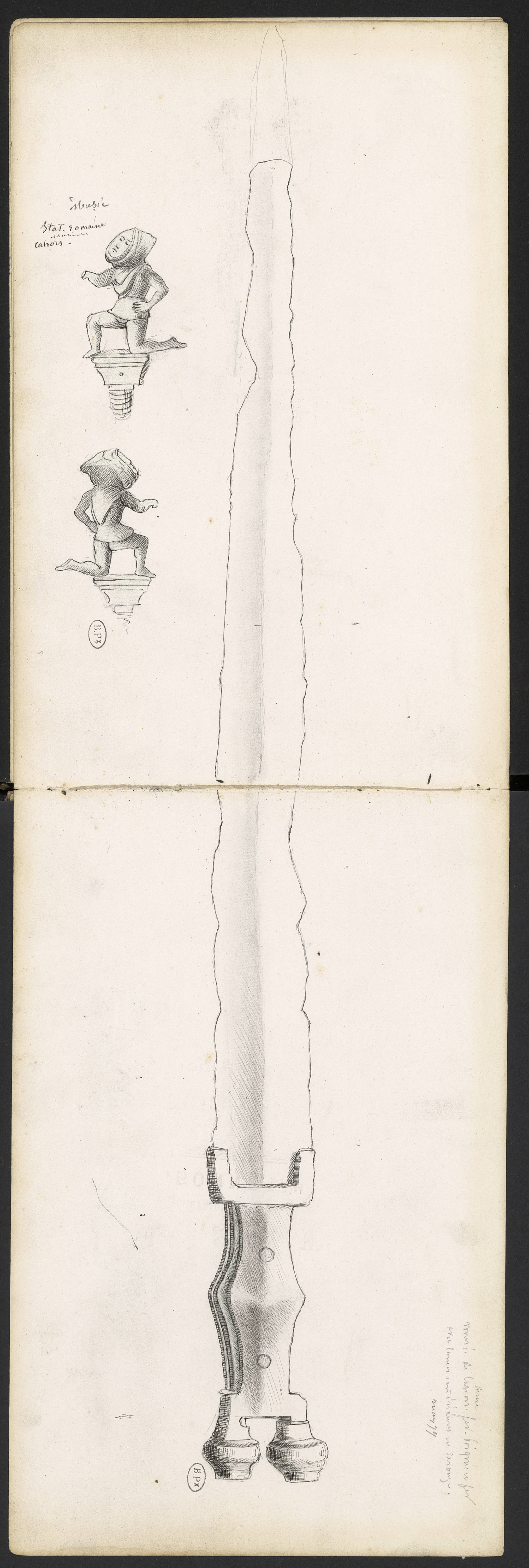 Statuette habillée d'un cucculus (habit à capuchon d'époque gallo-romaine) sur socle avec embout de vissage.