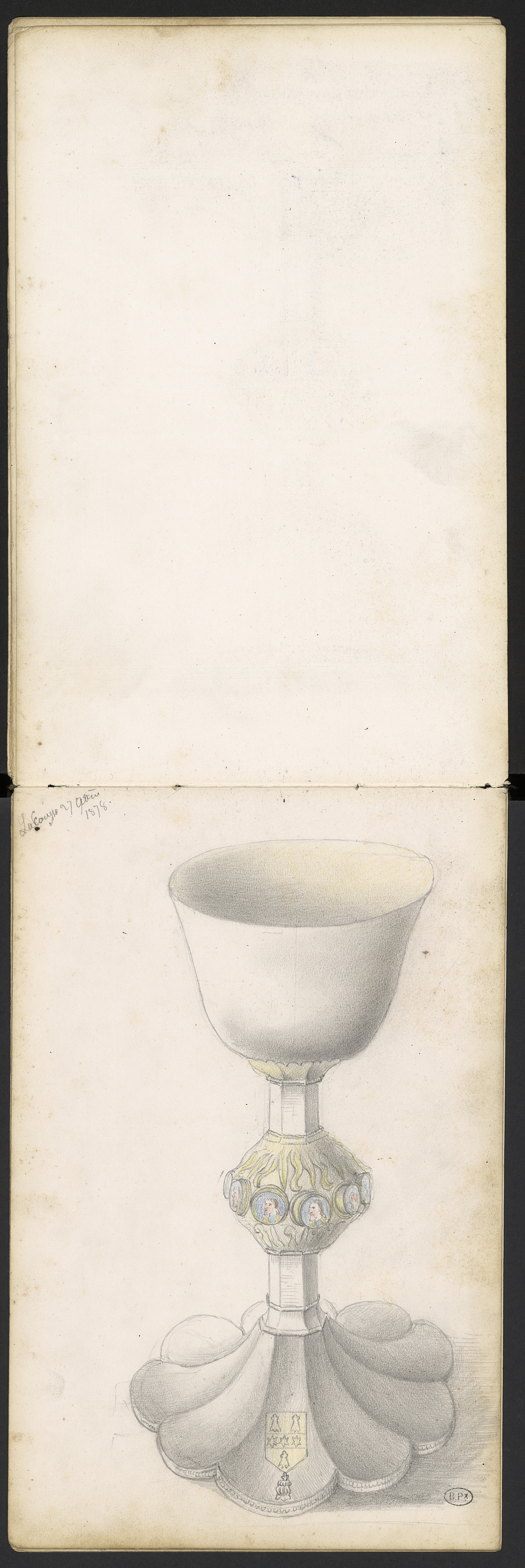 Calice de La Cousse à Coulaures avec bague flammée à cabochons émaillés avec portraits.