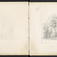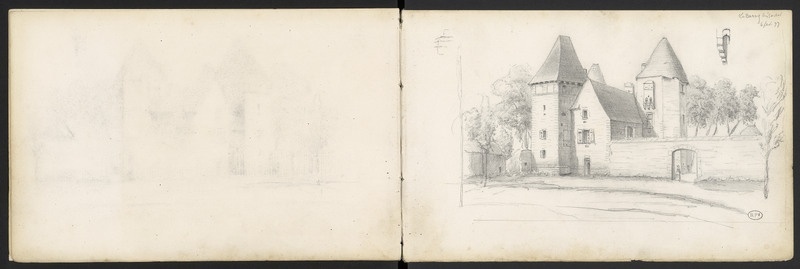 Château. Croquis d'un détail de mâchicoulis à double accolade sur cordeaux d'angle à triple ressauts.