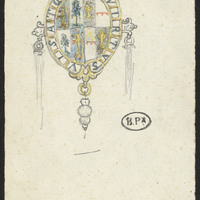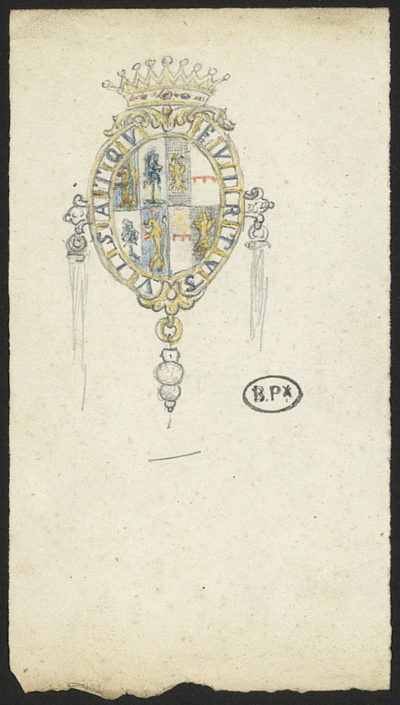 Ecartelé à senestre écartelé : Lasteyrie du Saillant (de) Marquis : Écartelé : aux 1 et 4, de sable, à l'aigle d'or ; aux 2 et 3, d'argent, au lambel de gueules. (Limousin). A dextre : à préciser.