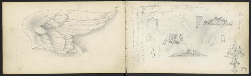 [Croquis de frontons de buffets à deux corps de Style Renaissance ou Louis XIII : demi fronton en arcade moulurée, rinceau, laurier, à l'épi à deux boules, corniche en coupe, fronton à deux rinceaux encadrant une coquille St-Jacques centrale pendante, croquis de fleur de Lys à rinceaux, de fronton triangulaire brisé au châtelet à boule, lame et ciseau, faucille à tranchoir motif de carrelage en chevrons, baie en accolade.]