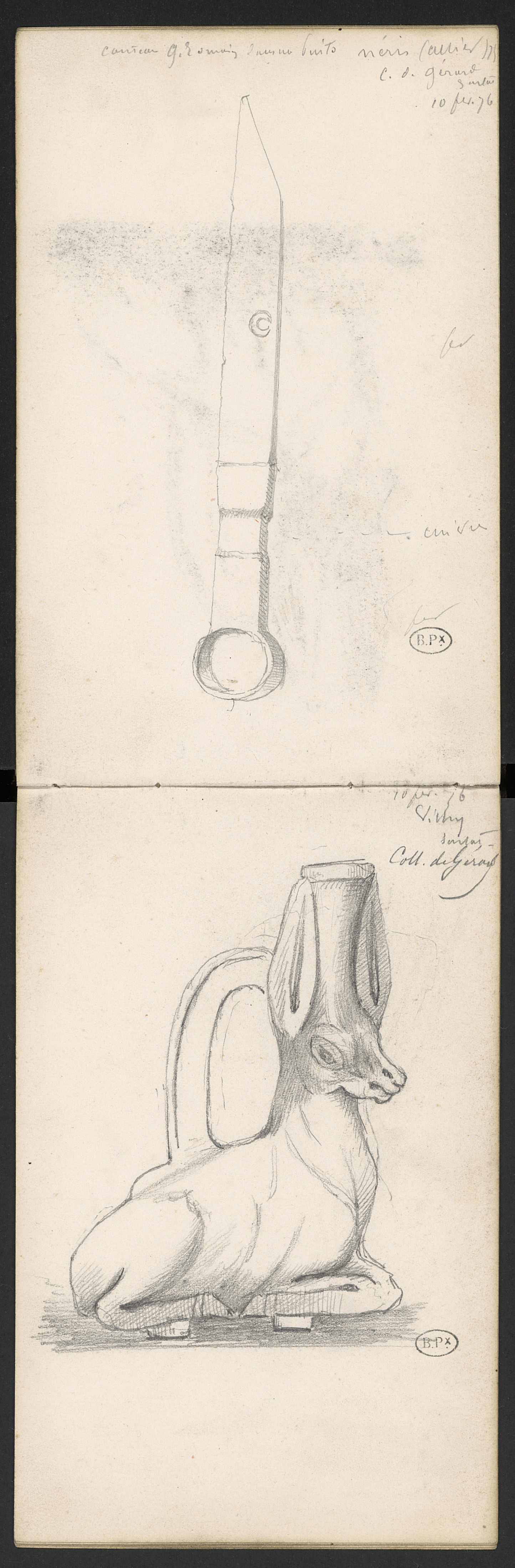 Collection de Gérard de Sarlat. Description à mettre en relation avec les autres objets de la Collection. Page précédente un couteau G[allo]rom[ain] en fer avec anneau pour ceinture . Néris (Allier). Marque de coutelier ou forgeron croissant de lune ou lettre ? 10 février 1876. Collection de Gérard de Sarlat. Vichy.