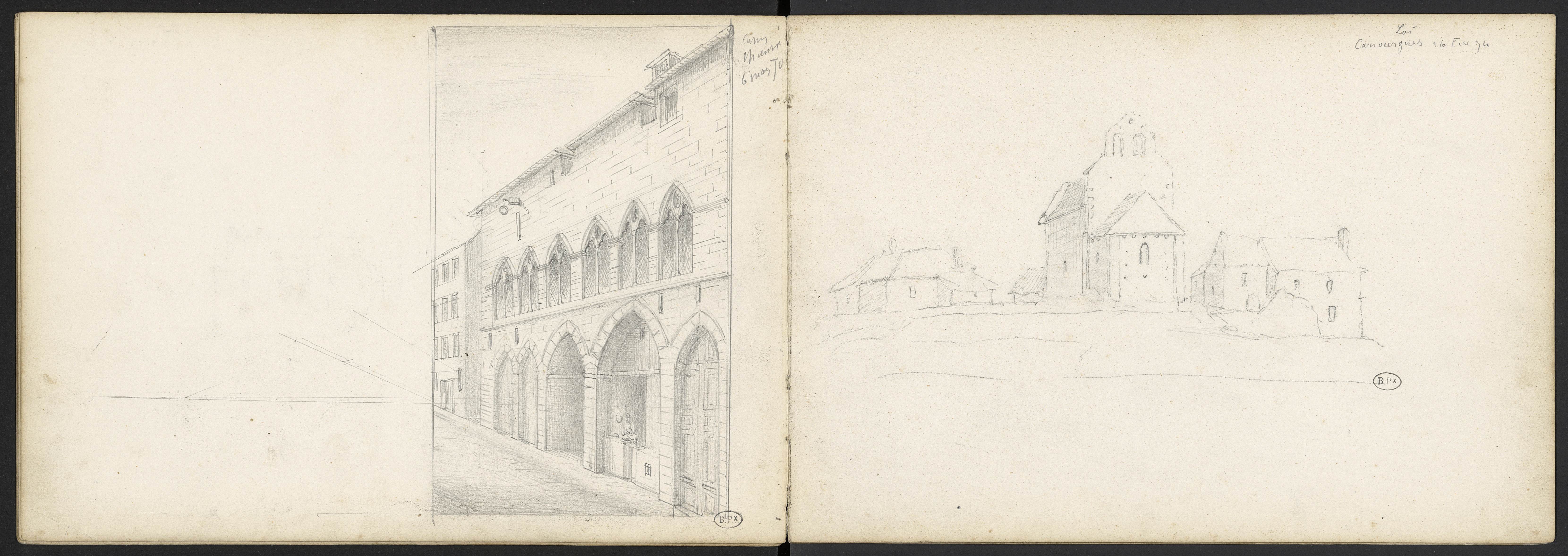 Église Saint-Martin de Canourgues. Page précédente, une maison médiévale à Cahors, dessin daté du 6 mars 70 (sic). Hôpital de Grossia du Barry des Soubirous. Demeure du XIIIème siècle donnée par la famille Grossia ou Gros à l'hôpital du Chapitre de Cahors. Belle ensemble de fenêtres en réseau. (à comparer au dessin du carnet 06_008).