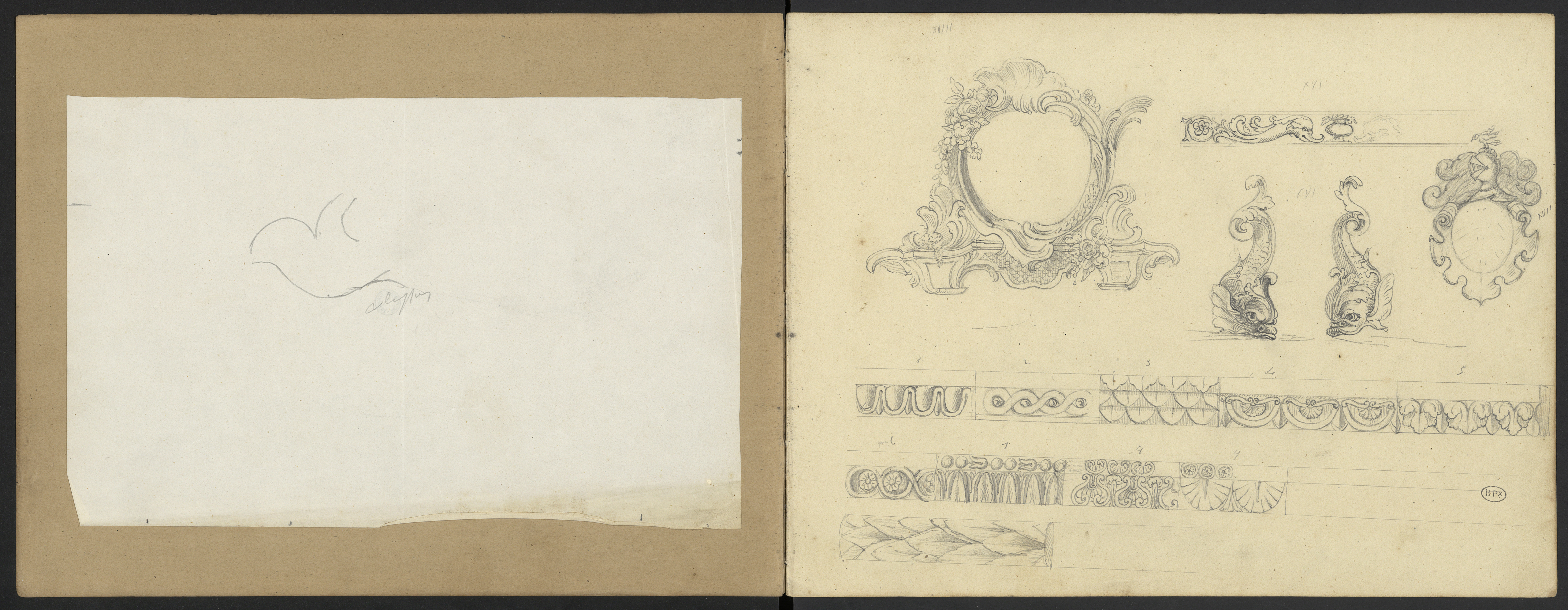Cadre rond à ornements de roses et rinceaux. Frise aux dauphins et fleurs XVI(ème siècle). Encadrement à volutes de parchemin surmonté d'un heaume de chevalier à lambrequins XVI(ème siècle). Deux dauphins en vis à vis XVI (siècle). Frises : 1 Frise avec oves et cordon à pendeloque, 2 Cordon en entrelacs sur réglette à cœur de cabochons , 3 Frise à 3 rangs d'écailles, celle chef trilobée, 4 Frise à coquilles surmontées de volutes en S en opposition supporté part un cordon en demi cercle scandé de pendeloques lancettes , 5 Frise à feuilles de choux tri-feuillée et pendeloque, 6 à entrelacs fleuris, 7 Frise à palmettes verticales et guirlande deux boules et une corolle, 8 Frise à volutes en S en vis à vis encadrant une coquille surmontée d'une corolle en feuillage scandées d’œillets ornementaux surmontées d'une guirlande de coquilles entourées de volute en C couché. 9 Tête de palmette surmontée d'une guirlande de Bezons aux quatre-feuilles. Frise colonne aux feuilles de lauriers.