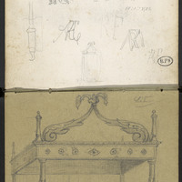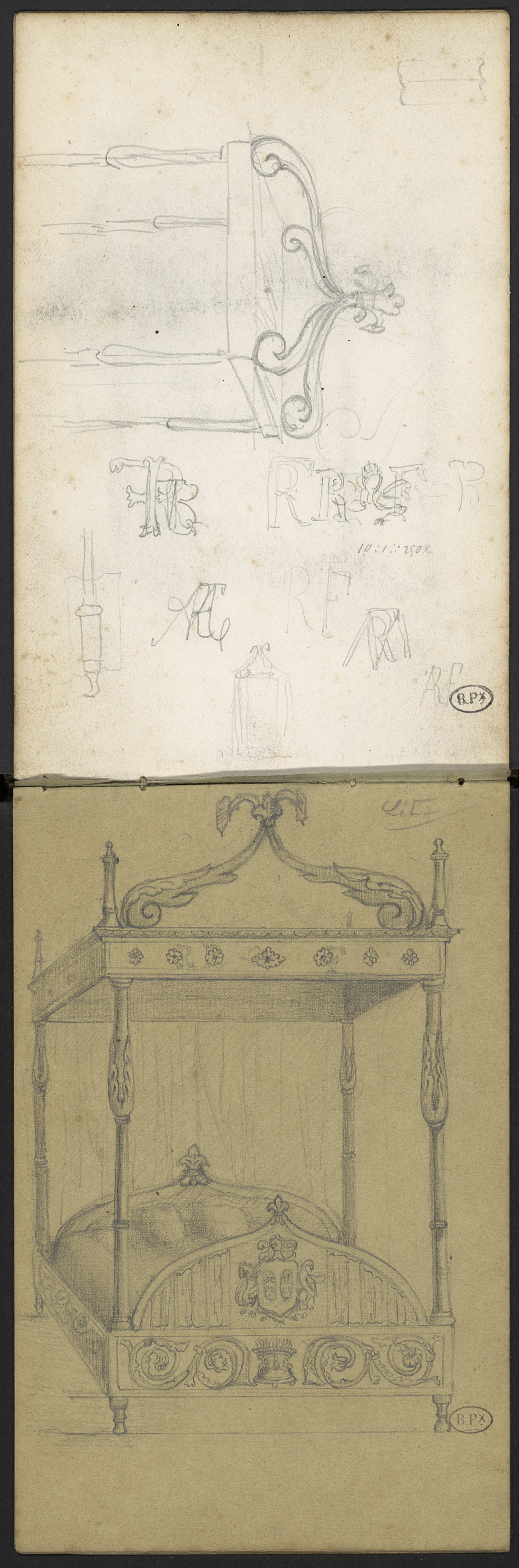 Lit à baldaquin, et divers croquis page précédente : baldaquin à quatre volutes et fleuron sur dais . Alphabet et monogrammes.