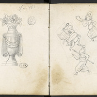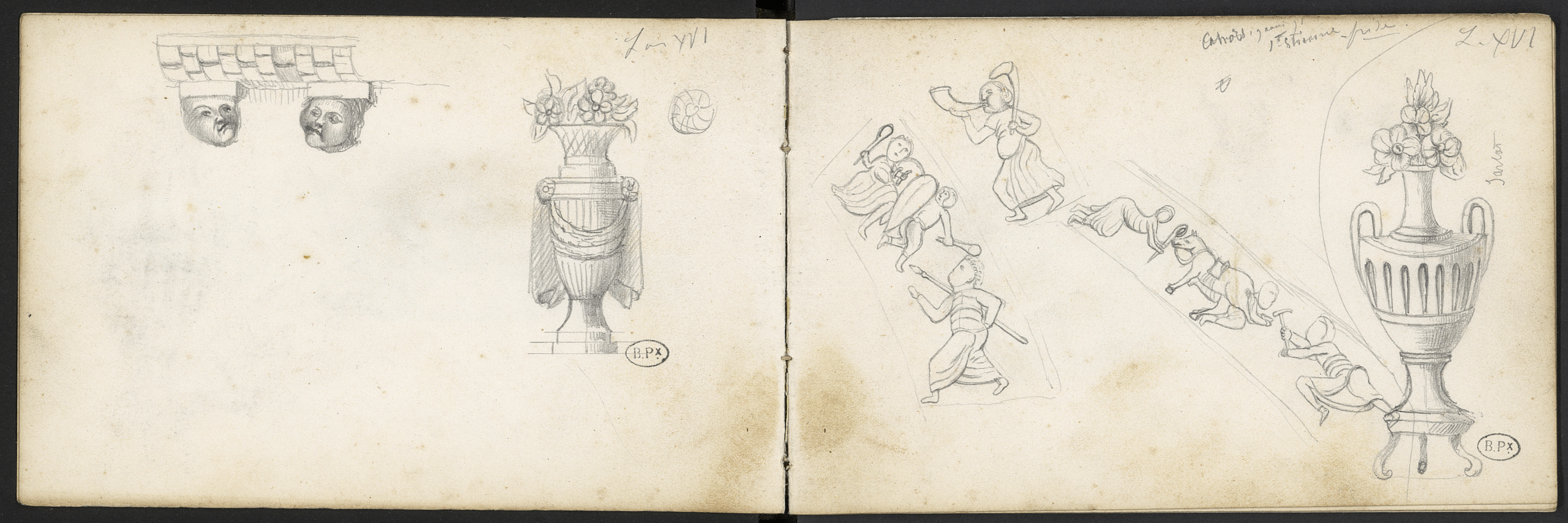 Éléments décoratifs, pris à la cathédrale St-Etienne de Cahors dans le Lot frise des combattants ou décor d'un pot tripode à anses garni de fleurs de style Louis XVI à Sarlat.