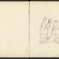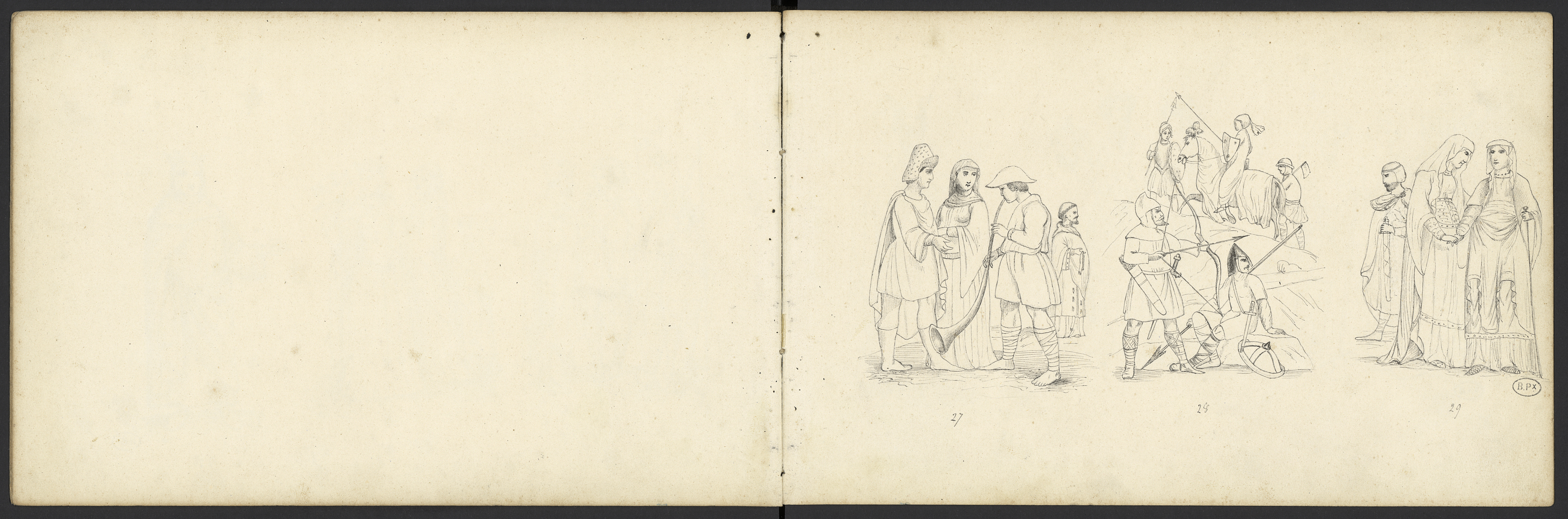 Groupe du couple et du joueur de busine avec un moine en arrière plan . Groupe composé de cinq hommes armés et d'un cheval caparaçonné. Groupe des deux femmes, de l'aristocrate au glaive et diadème royal.