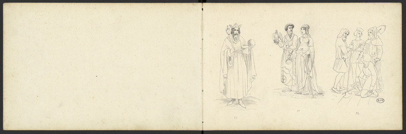 Un couple de noble se soutiennent, un épervier au bras de l'homme, une dague et un sabre à la ceinture, un collier à l'étoile d'or, une dame à coiffe ronde s'appuie sur un tau.