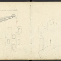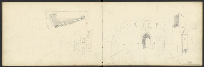 Page précédente : Dessin d'un heurtoir orné d'un serpent et croquis des murs de Domme.