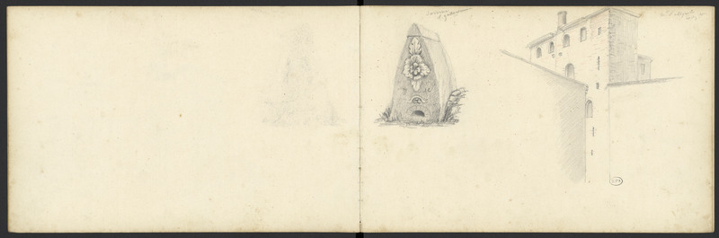Bloc monolithe taillé en forme d'habitation avec limier de faîtière, rosace avec deux feuilles en aplat, monogramme JC, porte cintrée sous bloc, sculpture non identifiée.