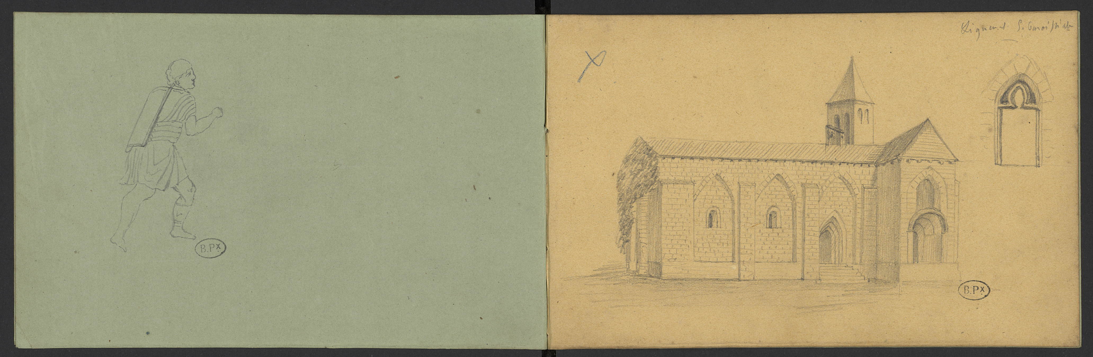 Abbaye Notre-Dame. Église.Détail de baie avec lancette. Sur l'autre page, un personnage d'aspect gallo-romain ?
