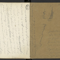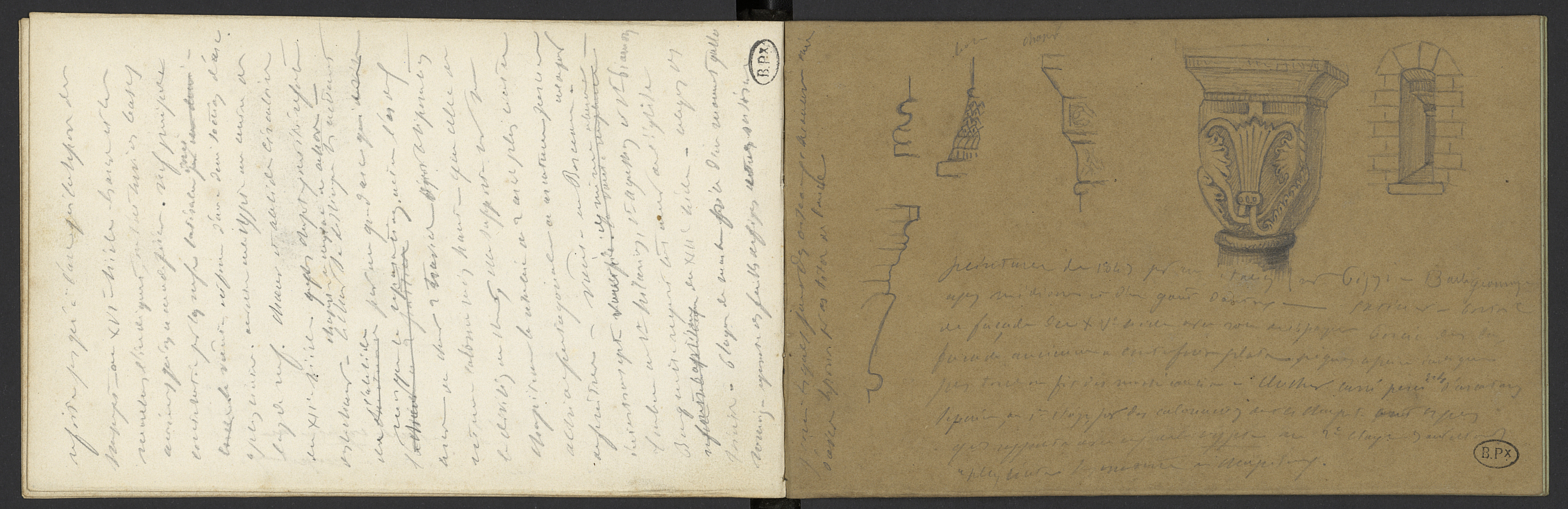 Texte manuscrit et croquis, dont des chapiteaux