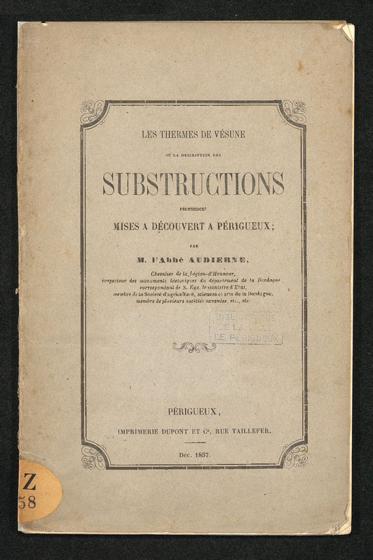 Les thermes de Vésune ou La Description des substructions récemment mises à découvert à Périgueux/ par M. l'abbé Audierne,.. - [S. l.] : [s. n.], 1857 (Périgueux) : impr. Dupont). - 20 p. ; 21 cm.