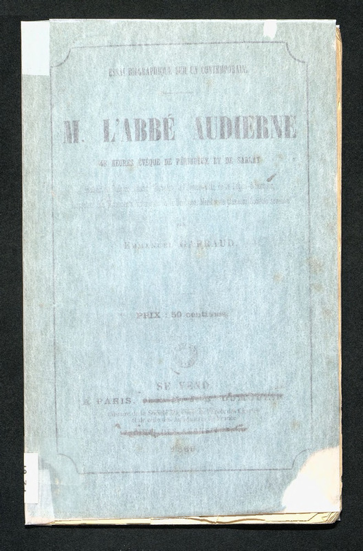 M. l'Abbé Audierne : 48 heures évêque de Périgueux et de Sarlat... : essai biographique sur un contemporain / par Emmanuel Garraud. - Paris : J.-B. Dumoulin, 1869 (Périgueux) : impr. Ch. Rastouil). - 16 p. : front. ; 21 cm. - Autre titre :" Essai biographique sur un contemporain ". " Monsieur l'abbé Audierne ".