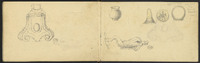 Sceau bagué en cuivre trouvé à P[érigueu]x avec probablement intaille d'un cavalier à cheval en costume dub XVIème siècle terrassant un dragon ( peut-être St-Georges ? ) , céramique de forme oulla, dauphin ornemental .
