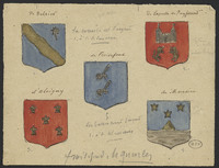 Planche représentant les armoiries des familles ayant habités La Rolphie. D'Aloiggny, de Froidefond, Delaporte de Puyferrat, de Meredieu, de Belcier.