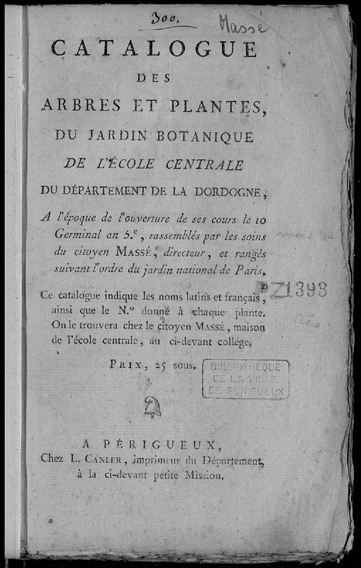 Catalogue des arbres et plantes, du jardin botanique de l'Ecole centrale du département de la Dordogne, à l'époque de l'ouverture de ses cours le 10 Germinal an 5e, rassemblés par les soins du citoyen Massé..