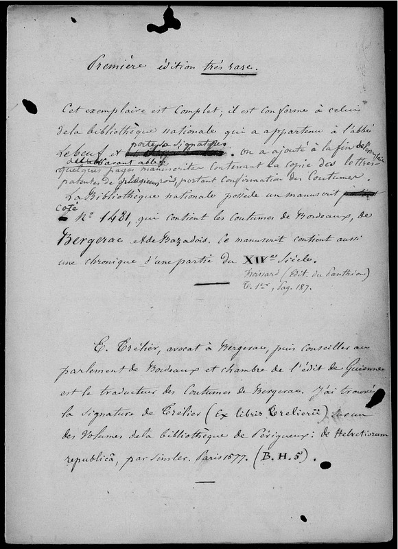 Droit coutumier français : Bergerac : Dordogne : 16e siècle ; Imprimeur ; Ex-dono ; Lapeyre ; Jurisprudence ; Périgord