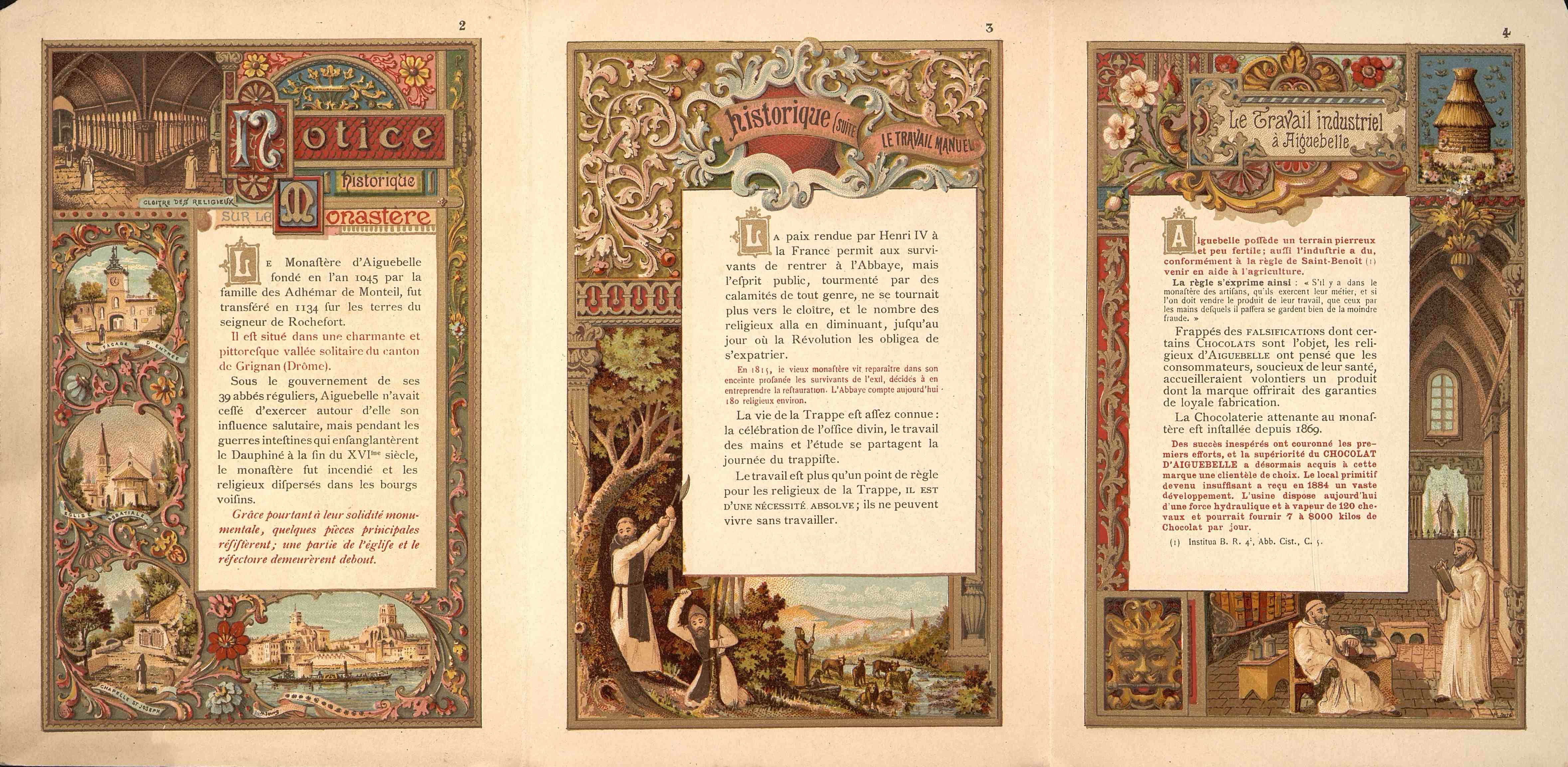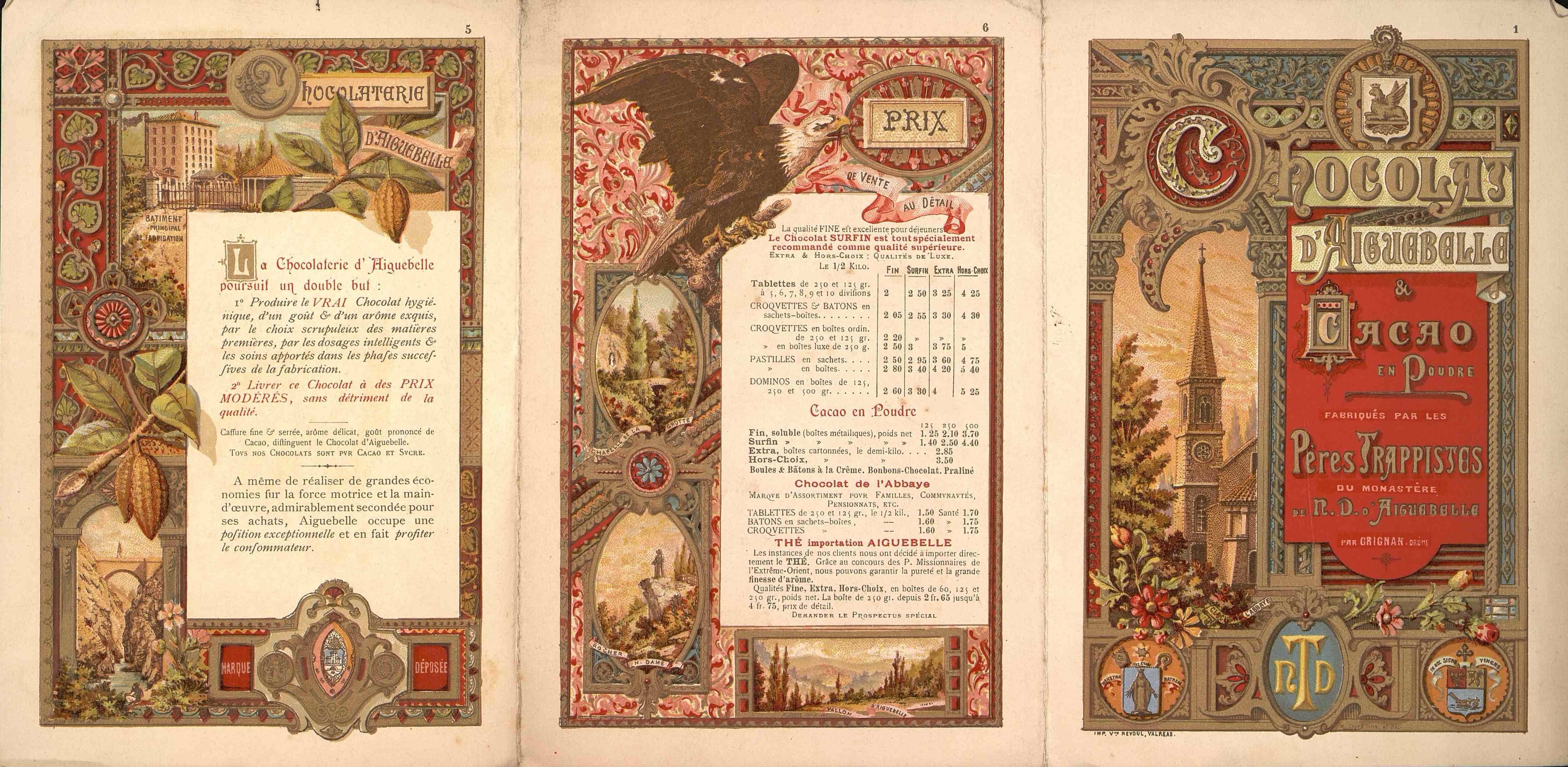 Dépliant publicitaire : Chocolat d'Aiguebelle et cacao, fabriqués par les Frères Trappistes.
