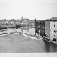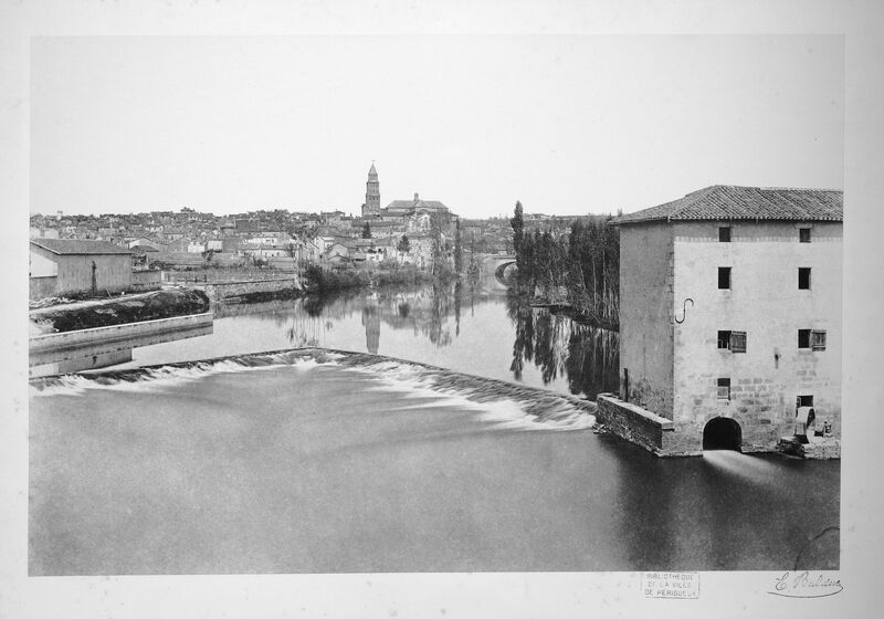 Tirage albuminé de la rivière Isle à Périgueux prise au niveau du moulin de Cachepur et de la retenue d'eau en V. La cathédrale St-Front est visible au centre de la prise de vue.