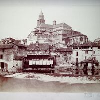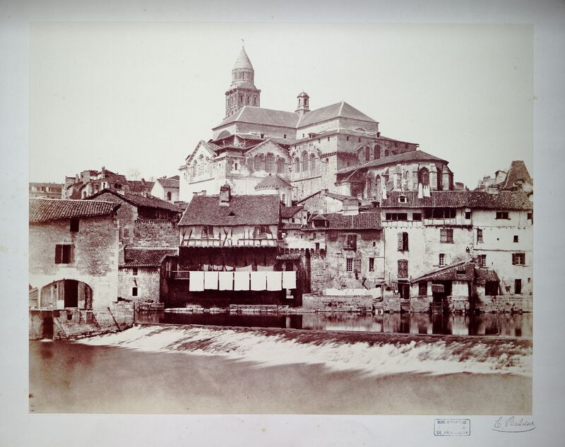 Tirage albuminé à partir d'une plaque de verre. Vue de la cathédrale Saint-Front depuis les berges du quartiers Saint-Georges. La photographie se situe quelques mètres en amont du pont de Tournepiche. On notera la présence de draps qui sèchent sur des cordes tendues entre deux maisons sur les bords de la rivière.