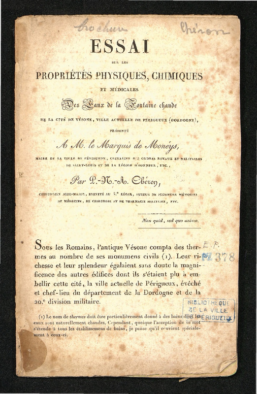 Essai sur les propriétés physiques, chimiques et médicales des eaux de la Fontaine Chaude de la cité de Vésone