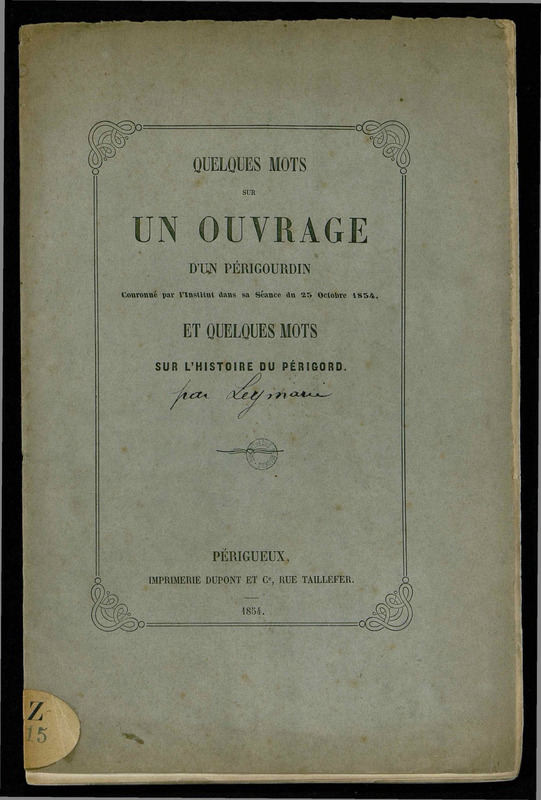 Quelques mots sur un ouvrage d'un périgourdin couronné par l' institut dans sa séance du 25 octobre 1854, et quelques mots sur l' histoire du Périgord