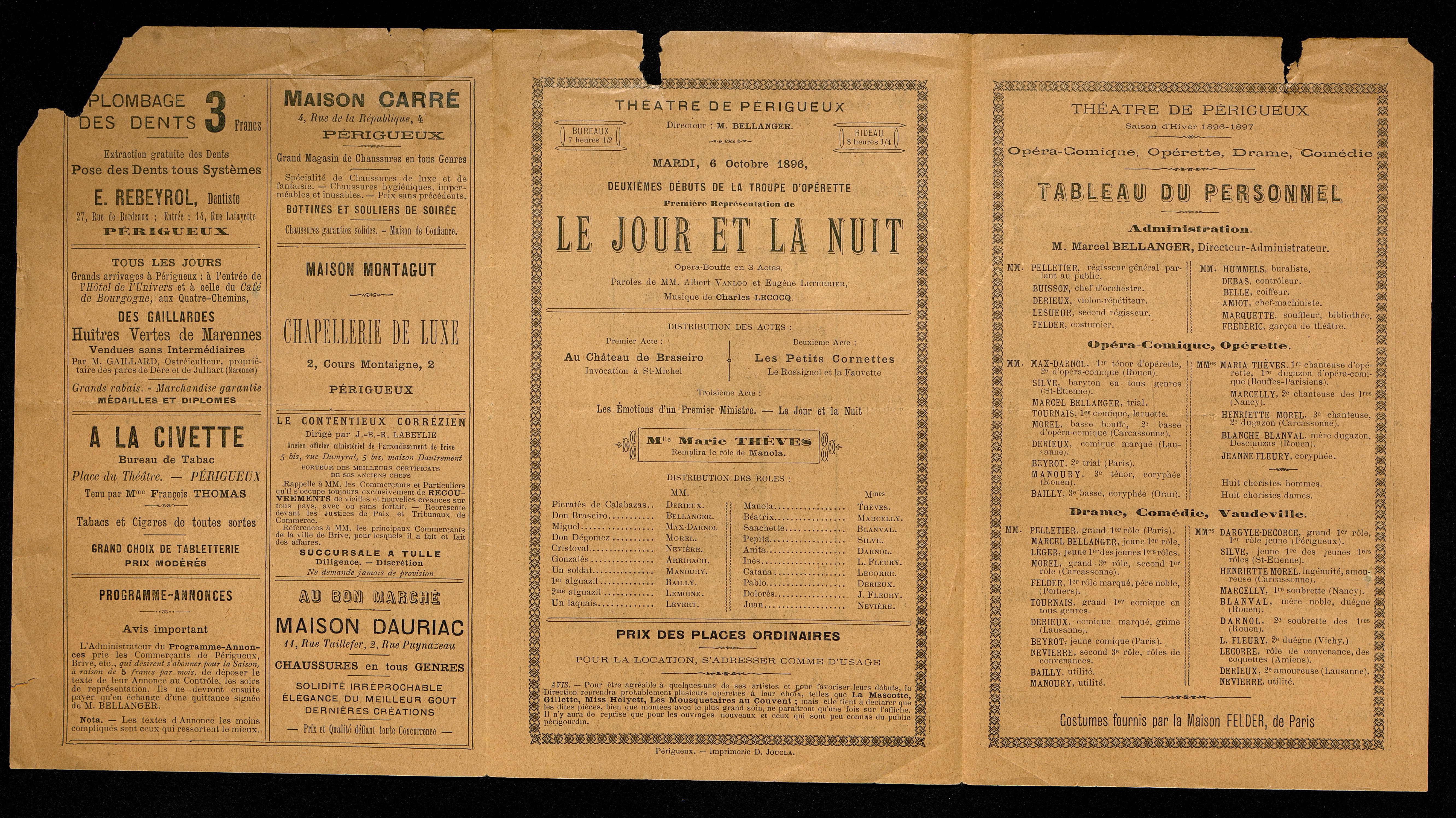 Programme de Théâtres de Périgueux, Brive...Saison 1896-1897. Le Jour et la nuit opéra - bouffe de Charles Lecocq donné le mardi 6 octobre 1896 au Théâtre de Périgueux