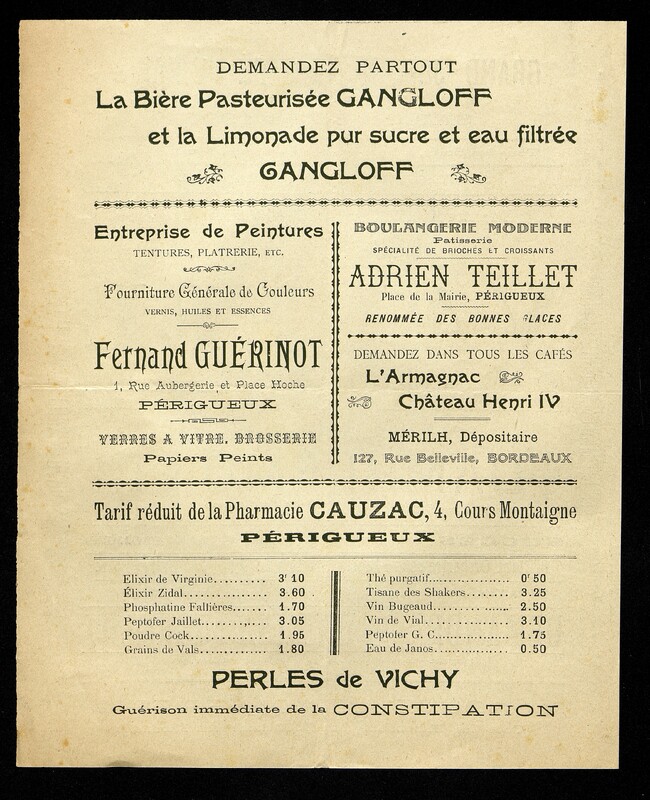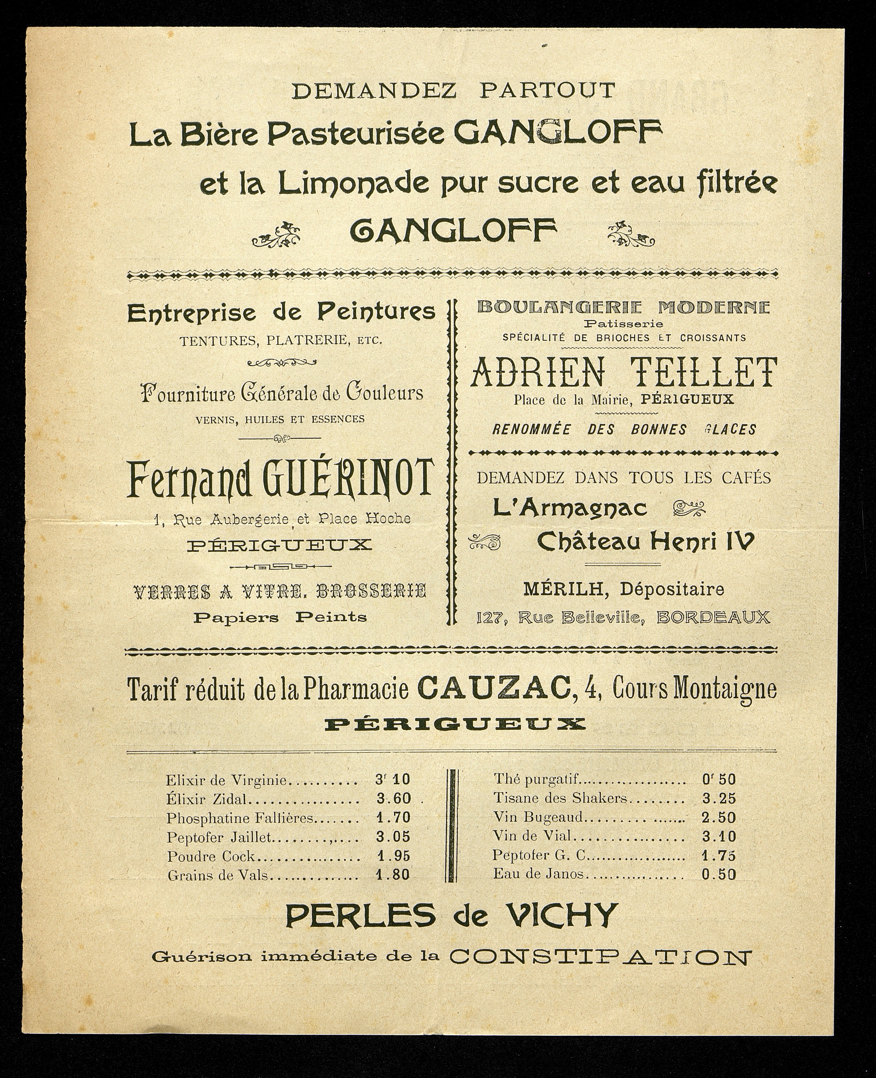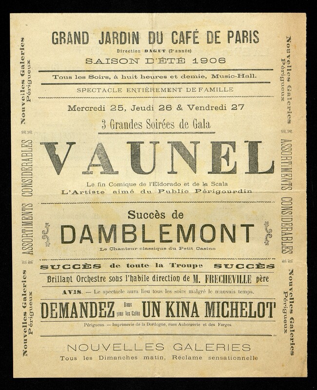 Programme du spectacle de Vaunel les 25, 26 et 27 [juillet ] 1906 à Périgueux au Grand Jardin du Café de Paris