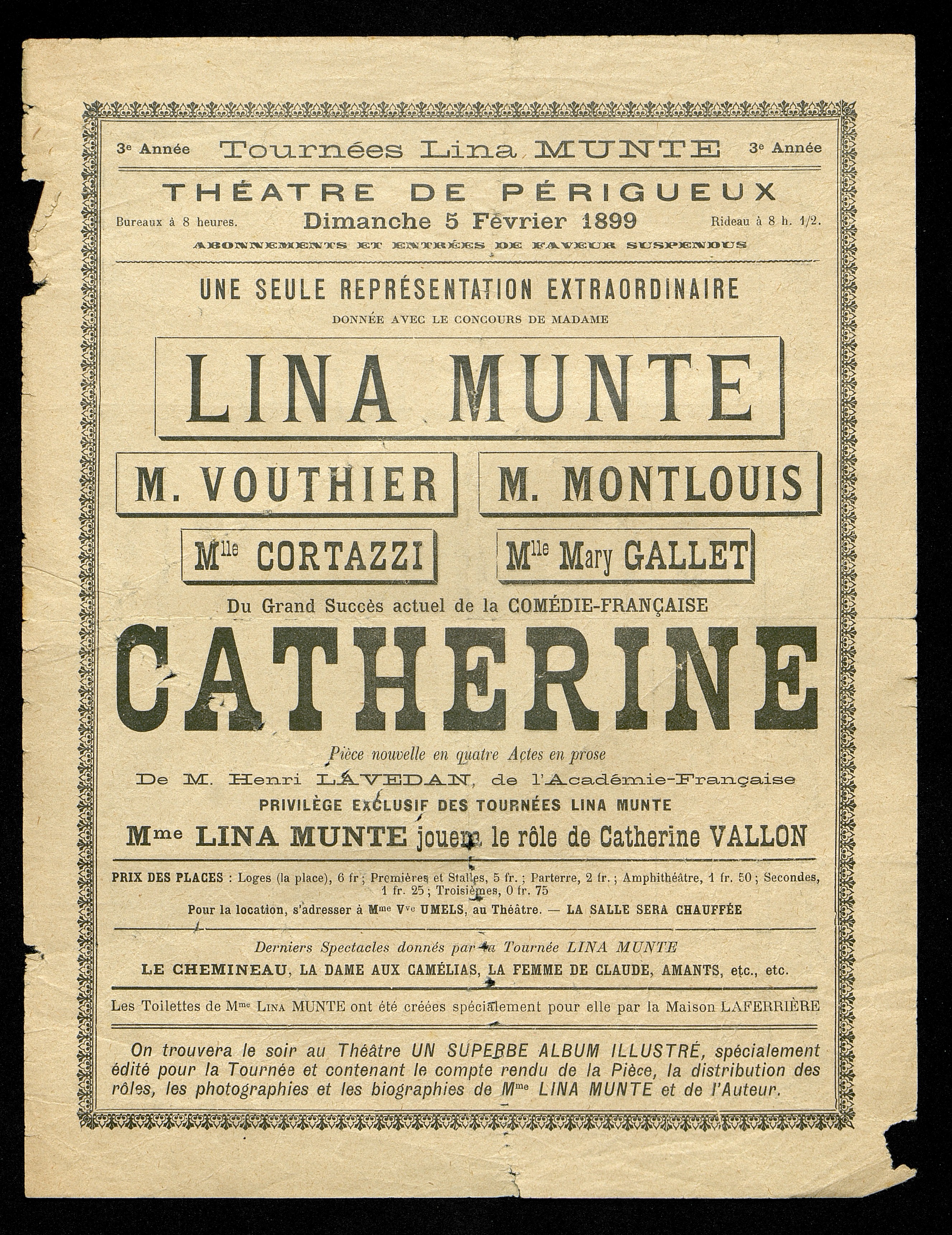 Au recto : affiche de la tournée Lina Munte ; au verso : distribution de la pièce de théâtre