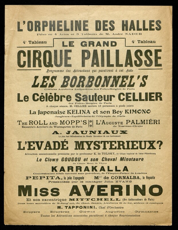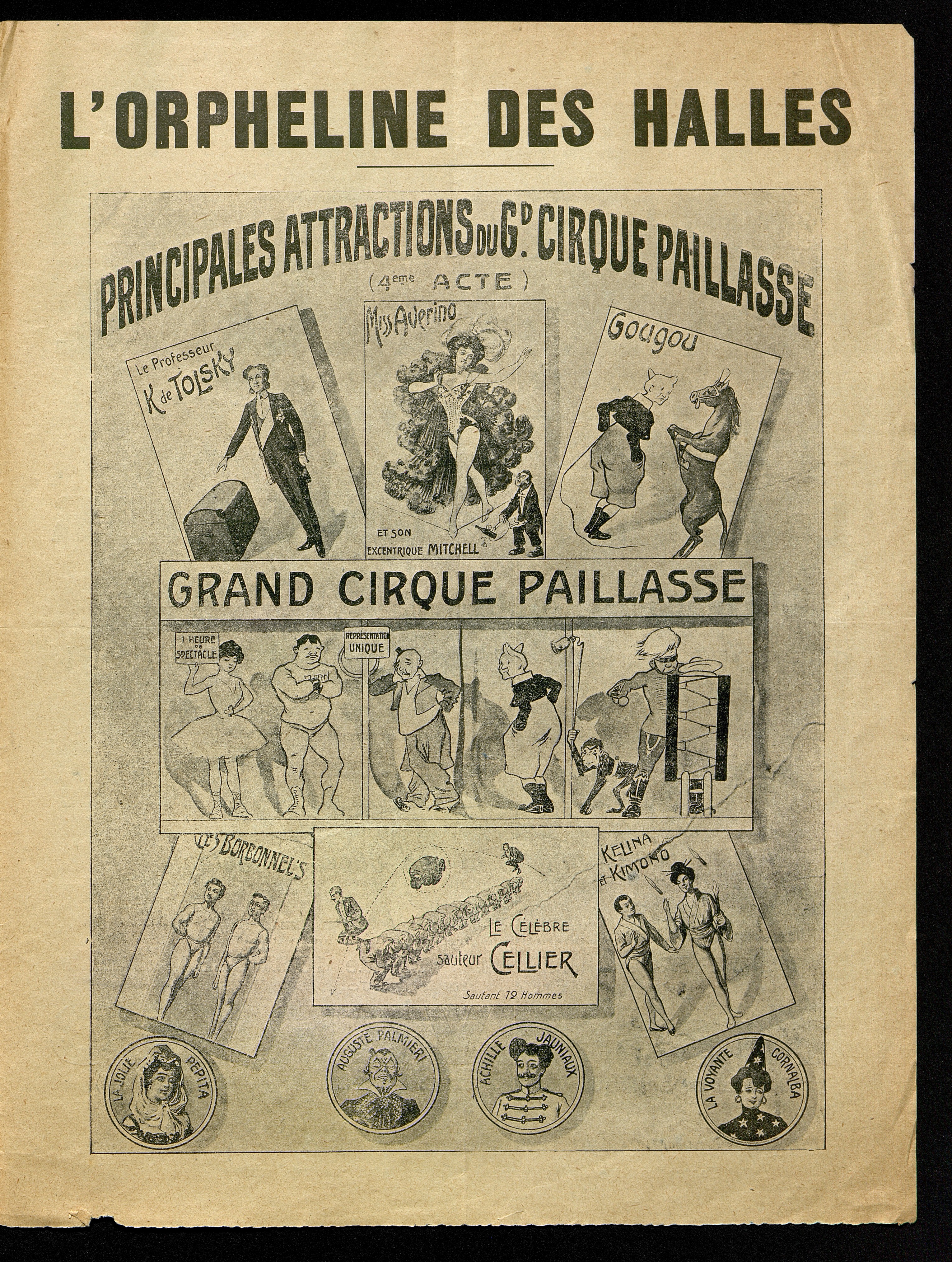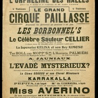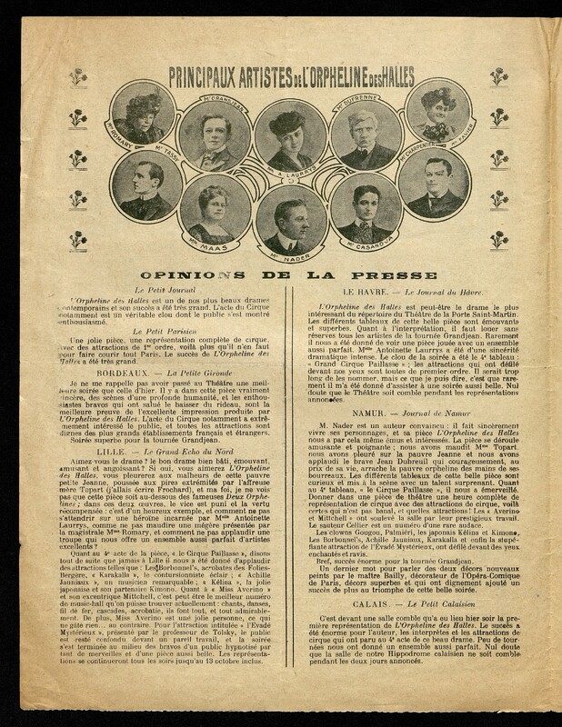 Au verso première page : distribution de la pièce de théâtre. Au recto de la première page : photographie des principaux artistes et opinion de la presse. Au recto de la deuxième page : programmations du Grand Cirque Paillasse. Au verso de la deuxième page : programmation générale