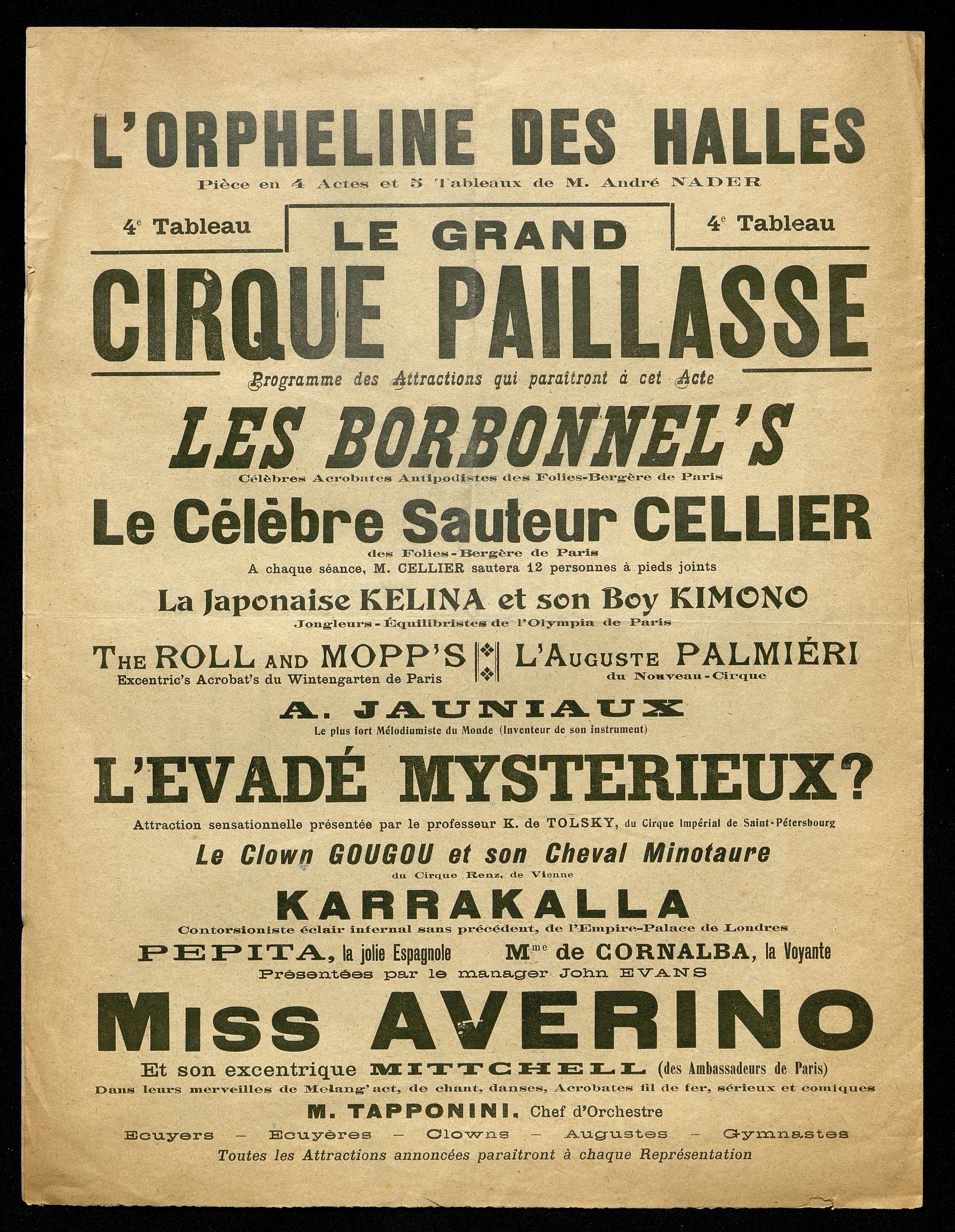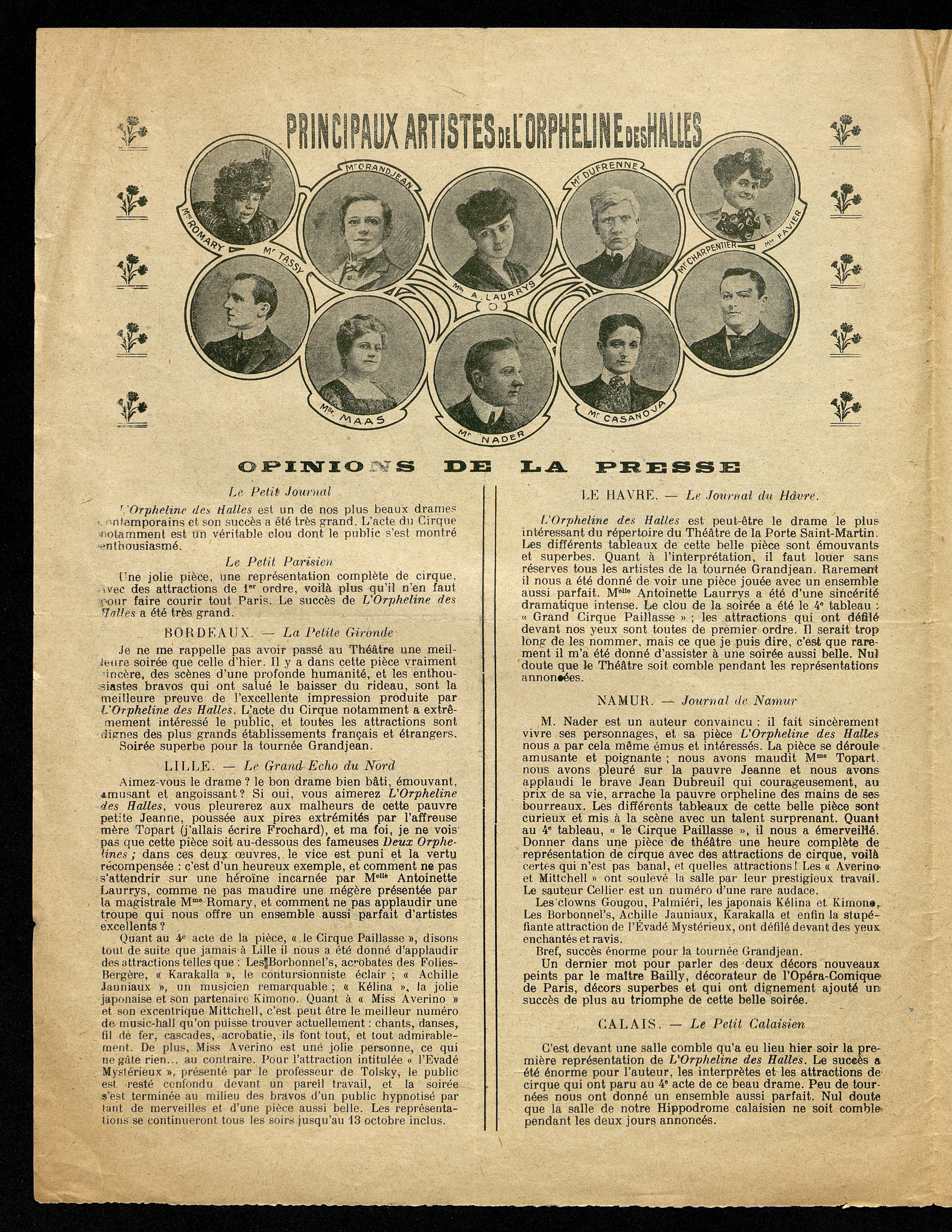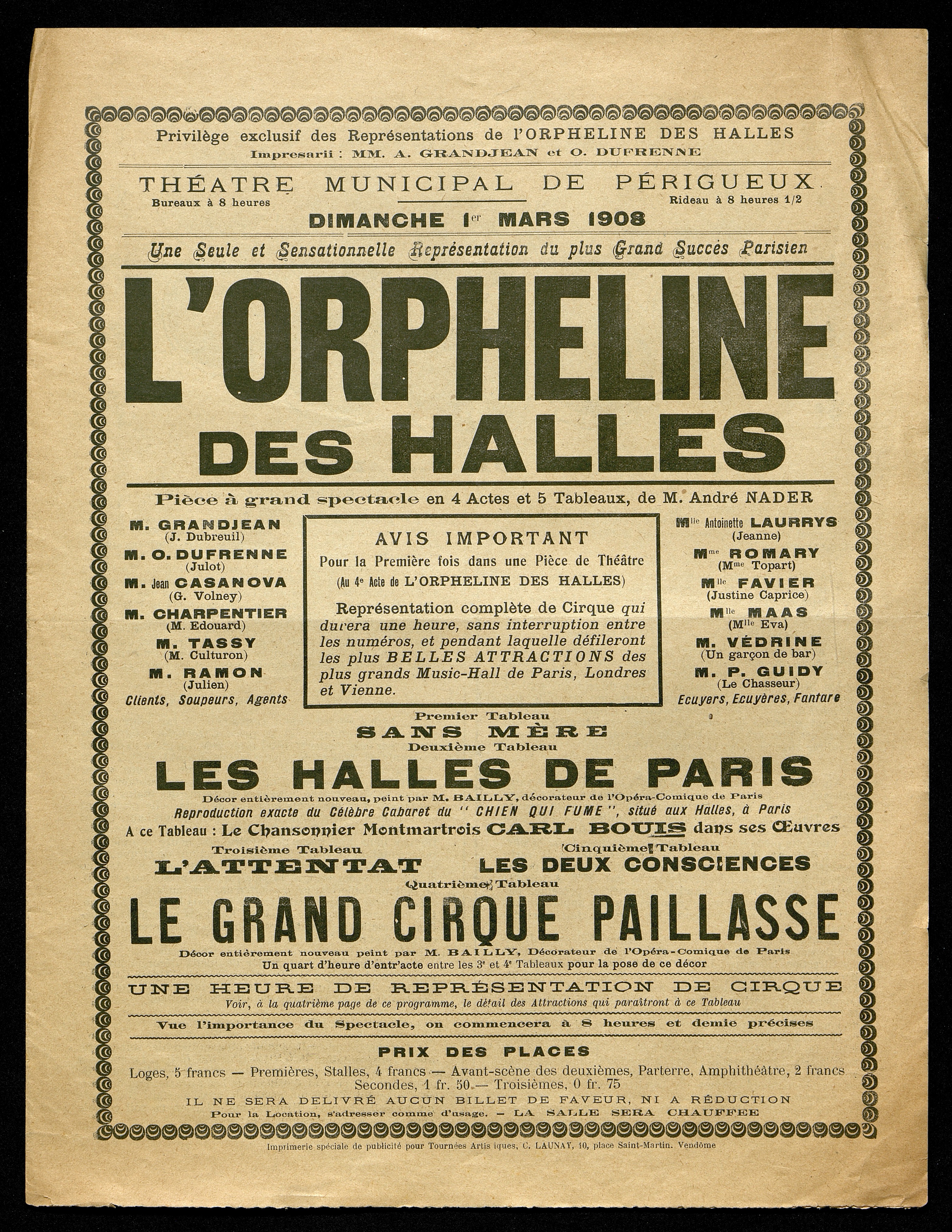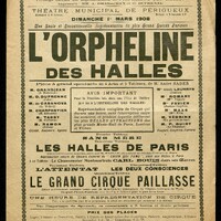 Programme de L'Orpheline des Halles, pièce d'André Nader jouée à Périgueux au Théâtre municipal le dimanche 1er mars 1908