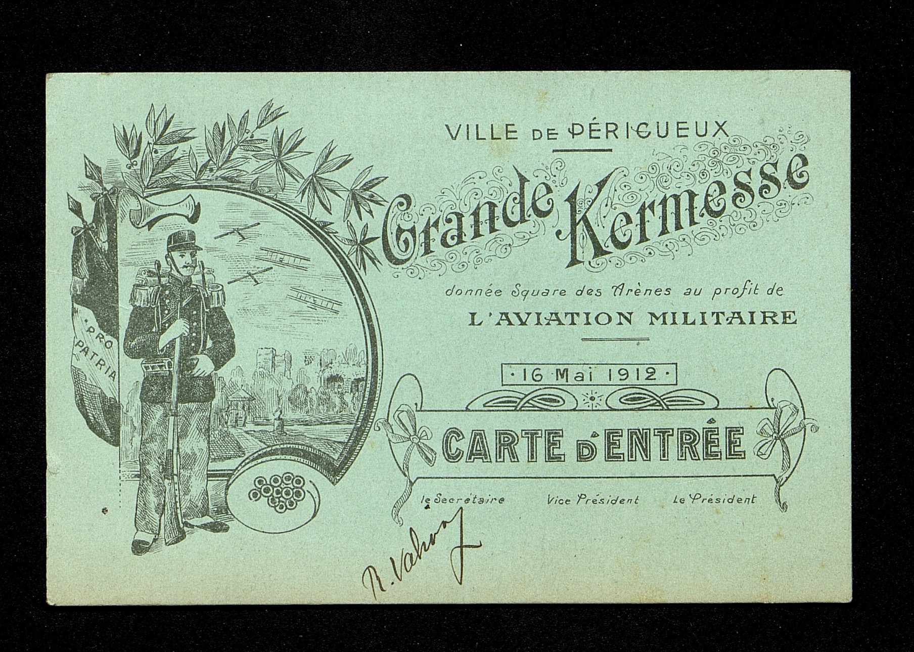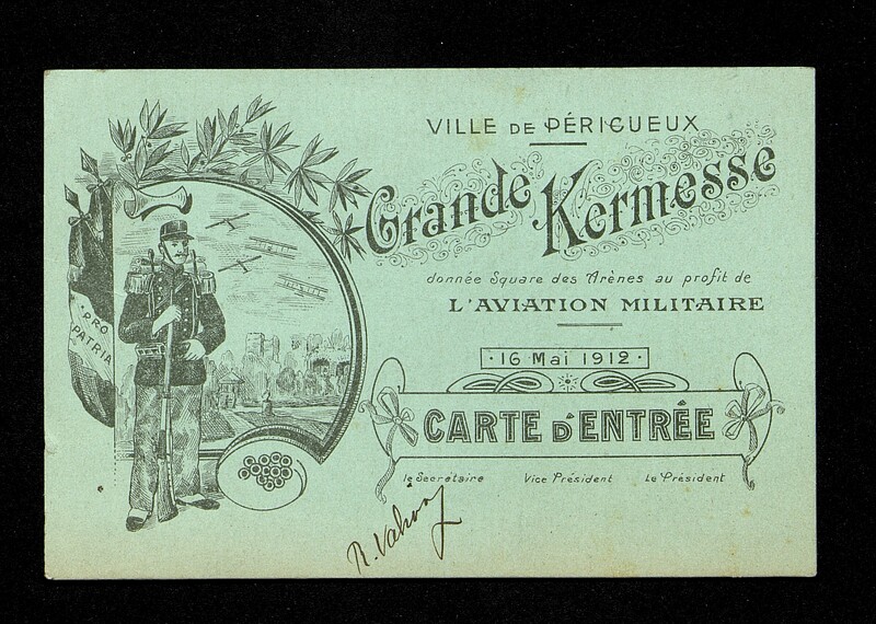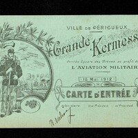 Carte d'entrée à la Grande Kermesse donnée Square des Arènes au profit de l'aviation militaire le 16 mai 1012