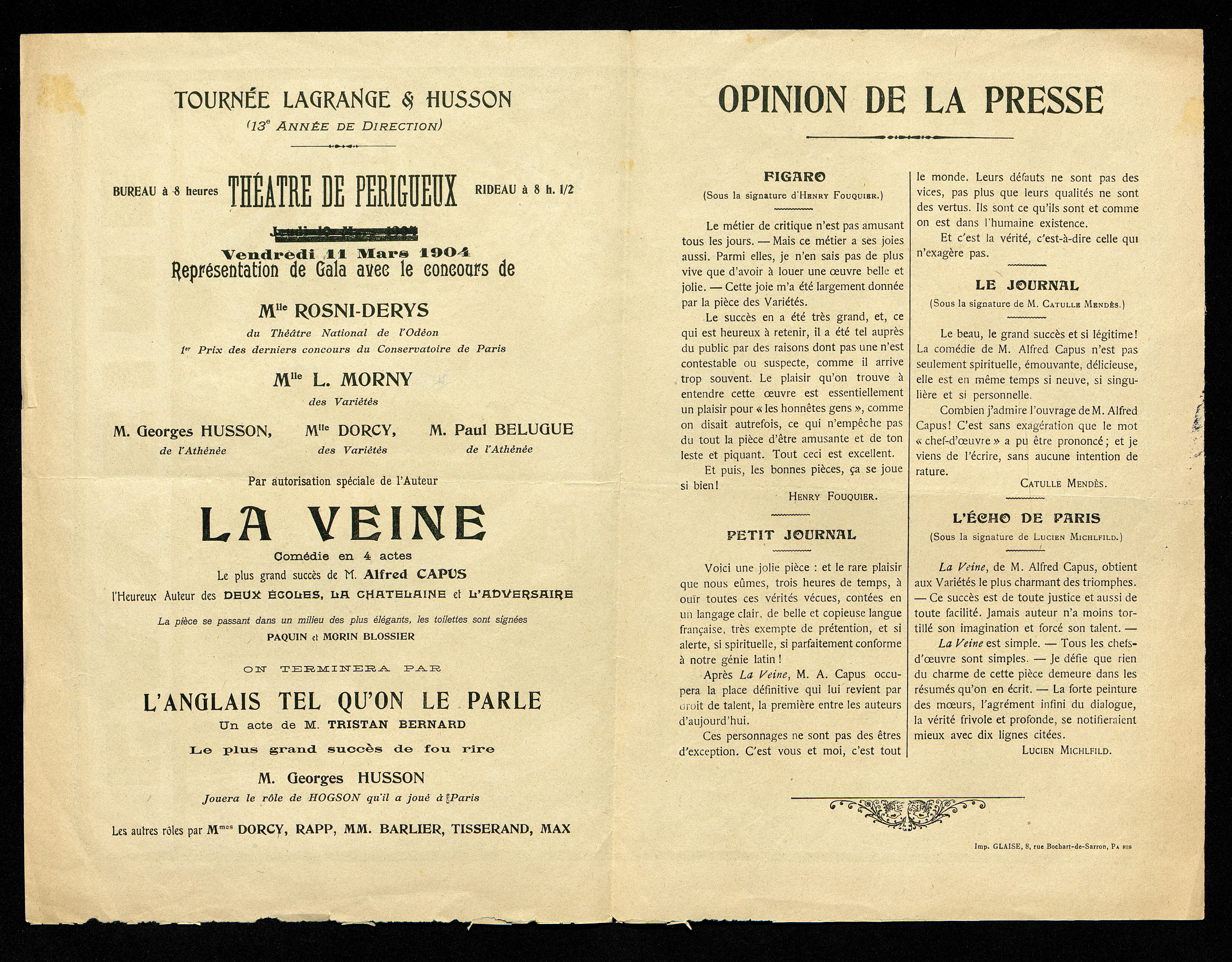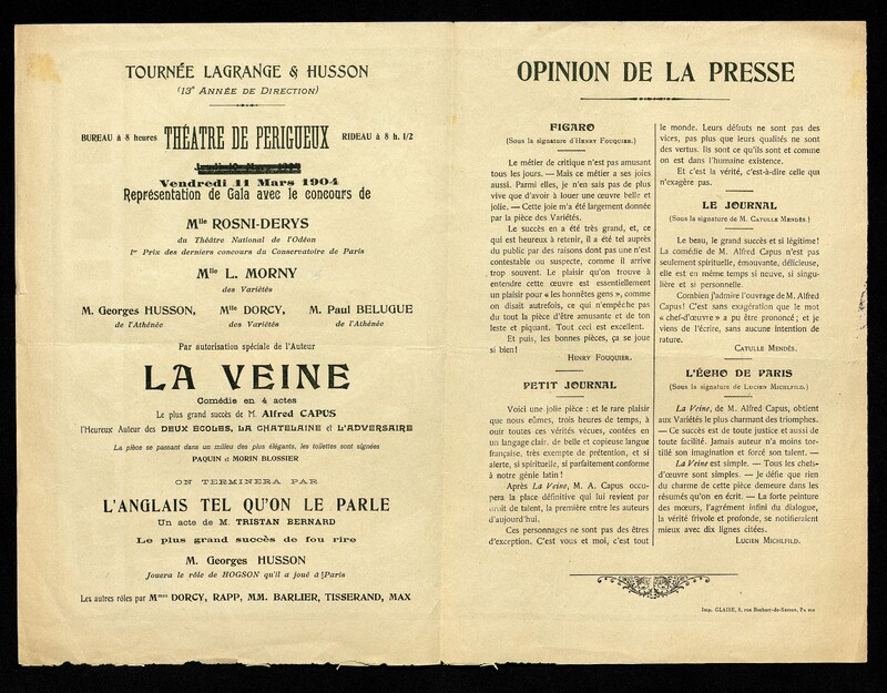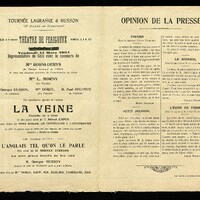 Au recto : Affiche de G. Marie pour le Théâtre des Variétés. Au verso : distribution des acteurs et opinion de la presse.