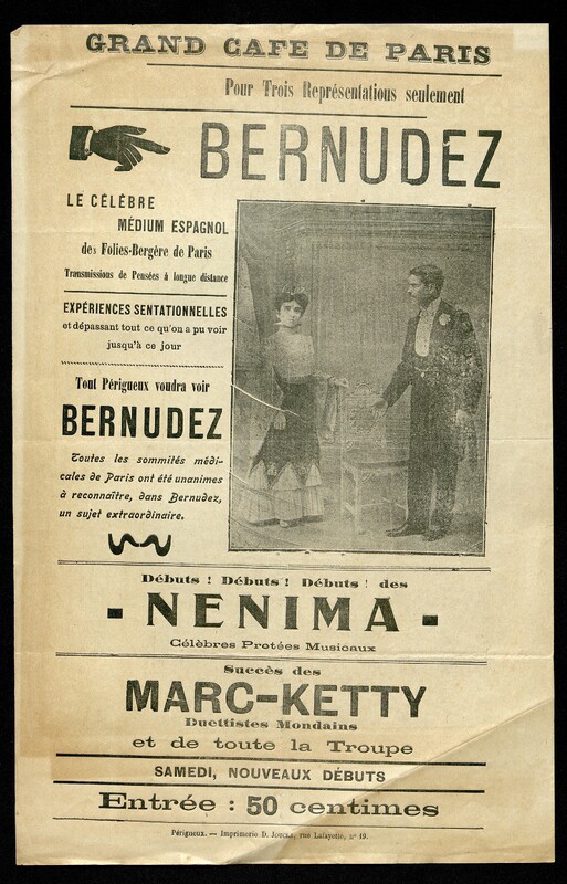 Affiche du spectacle de Bernuez le célèbre médium espagnol au Grand Café de Paris à Périgueux pour trois représentations seulement
