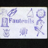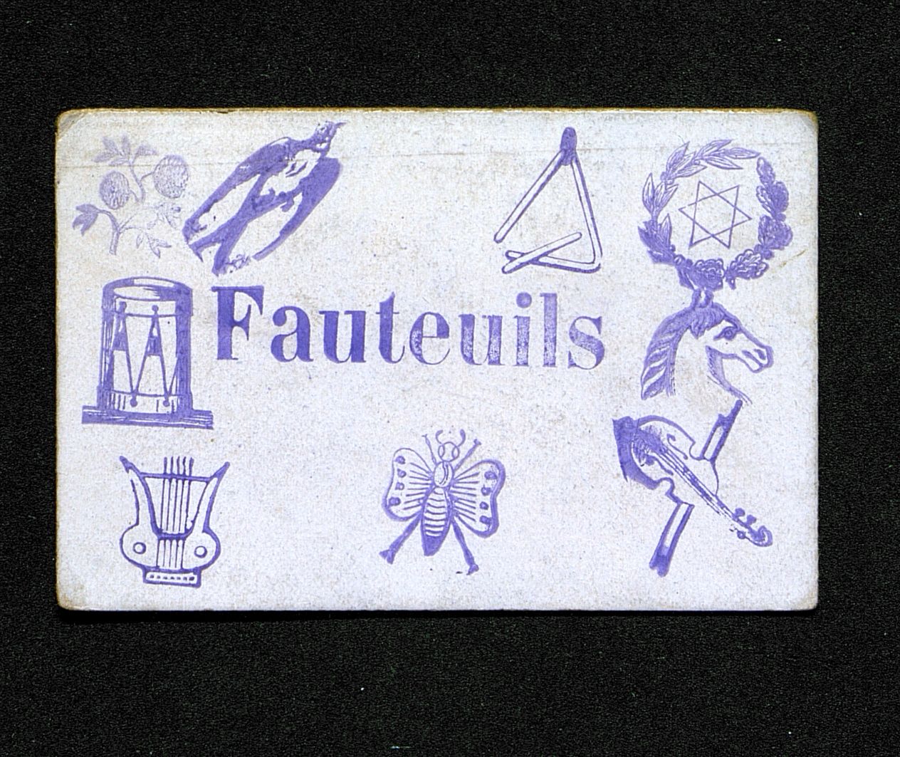 Carte de Fauteuils avec fleurs , hirondelle, triangle musical, étoile laurée, tête de cheval, viole, papillon, lyre et tambour