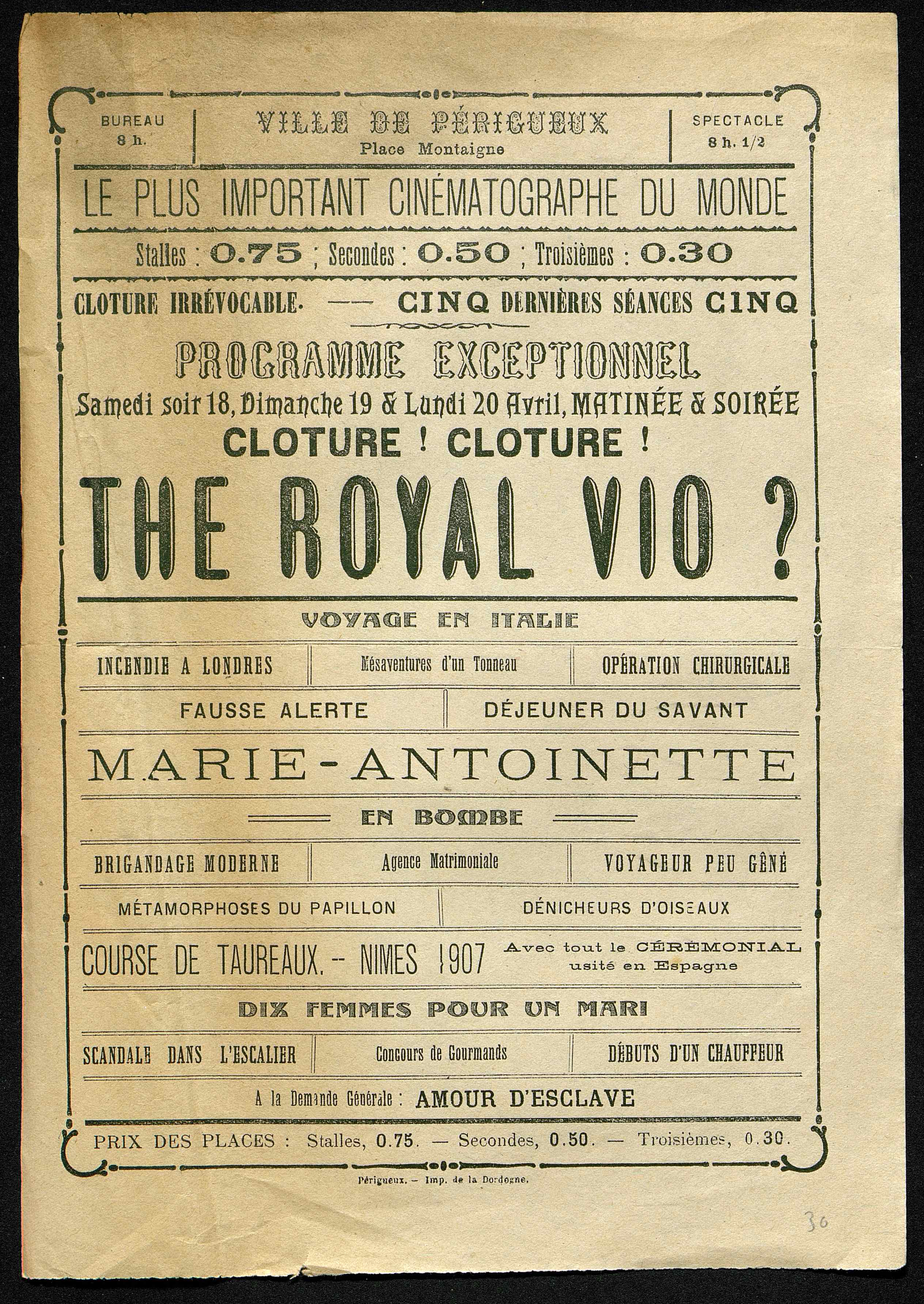 Le plus grand cinématographe du monde. Autres titres : Incendie à Londres; Mésaventures d'un tonneau ; Opération chirurgicale ; Fausse alerte ; Déjeuner savant ; Marie-Antoinette ; En bombe ; Brigandage moderne ; Agence matrimoniale ; Voyageur peu gêné ; Métamorphoses du papillon ; Dénicheurs d'oiseaux ; Course de taureaux , Nimes 1907 ; Dix femmes pour un mari ; Scandale dans l'escalier ; Concours de gourmands ; Débuts d'un chauffeur ; Amour d'esclave.