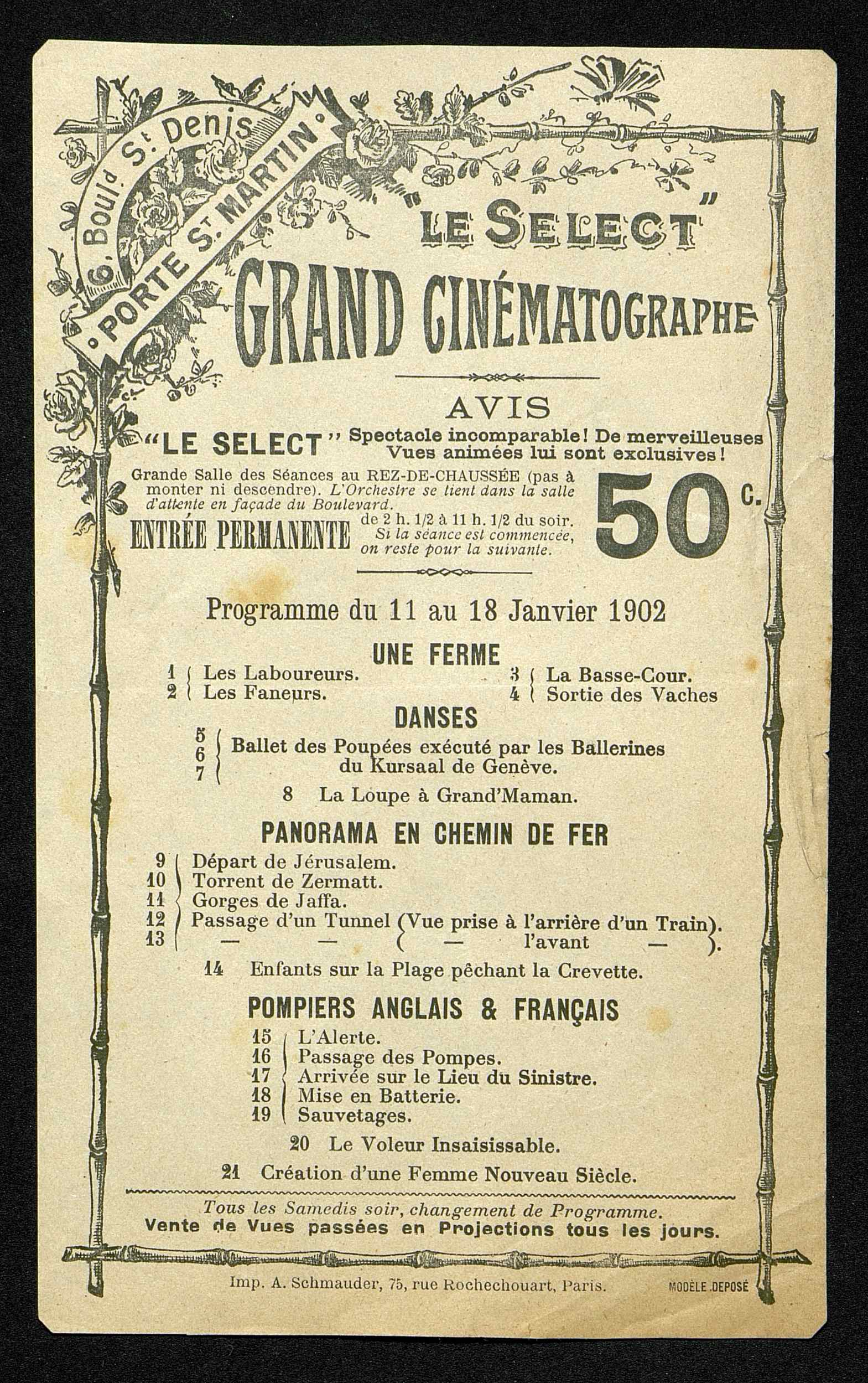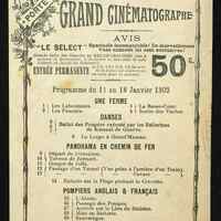 Programme du 11 au 18 Javier 1902 : Une ferme. Danses. Panorama en chemin de fer. Pompiers anglais et français. le voleur insaisissable. Création d'une feme nouveau siècle.