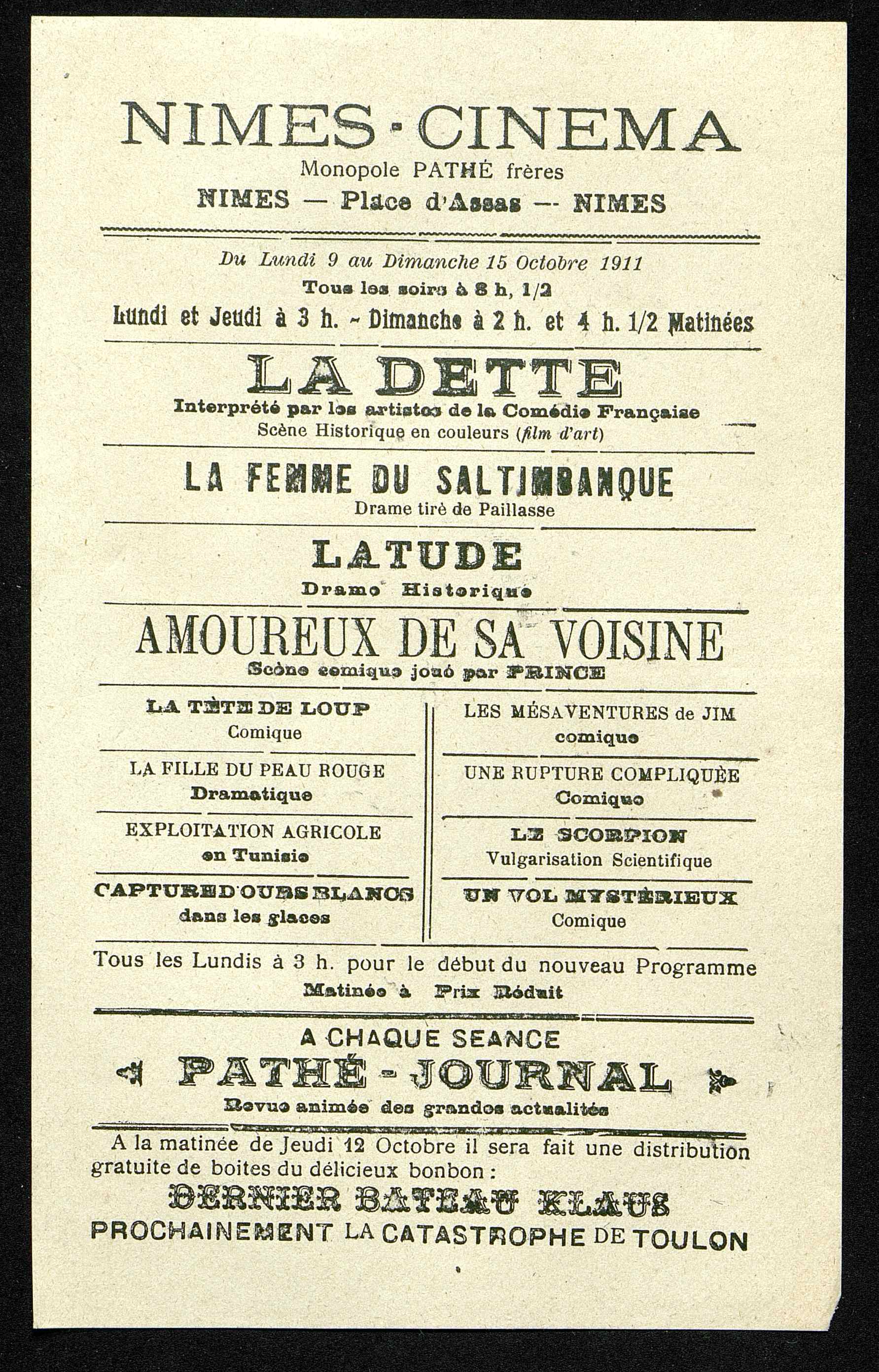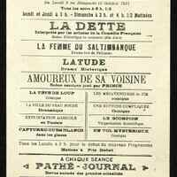 Programme : La Dette. La Femme du saltimbanque. Latude. Amoureux de sa voisine. La Tête de loup. La Fille du peau rouge. Exploitation agricole en Tunisie. Capture d'ours blancs. Les Mésanvatures de Jim. Une Rupture compliquée. Le Scorpion. Un Vol mystérieux.