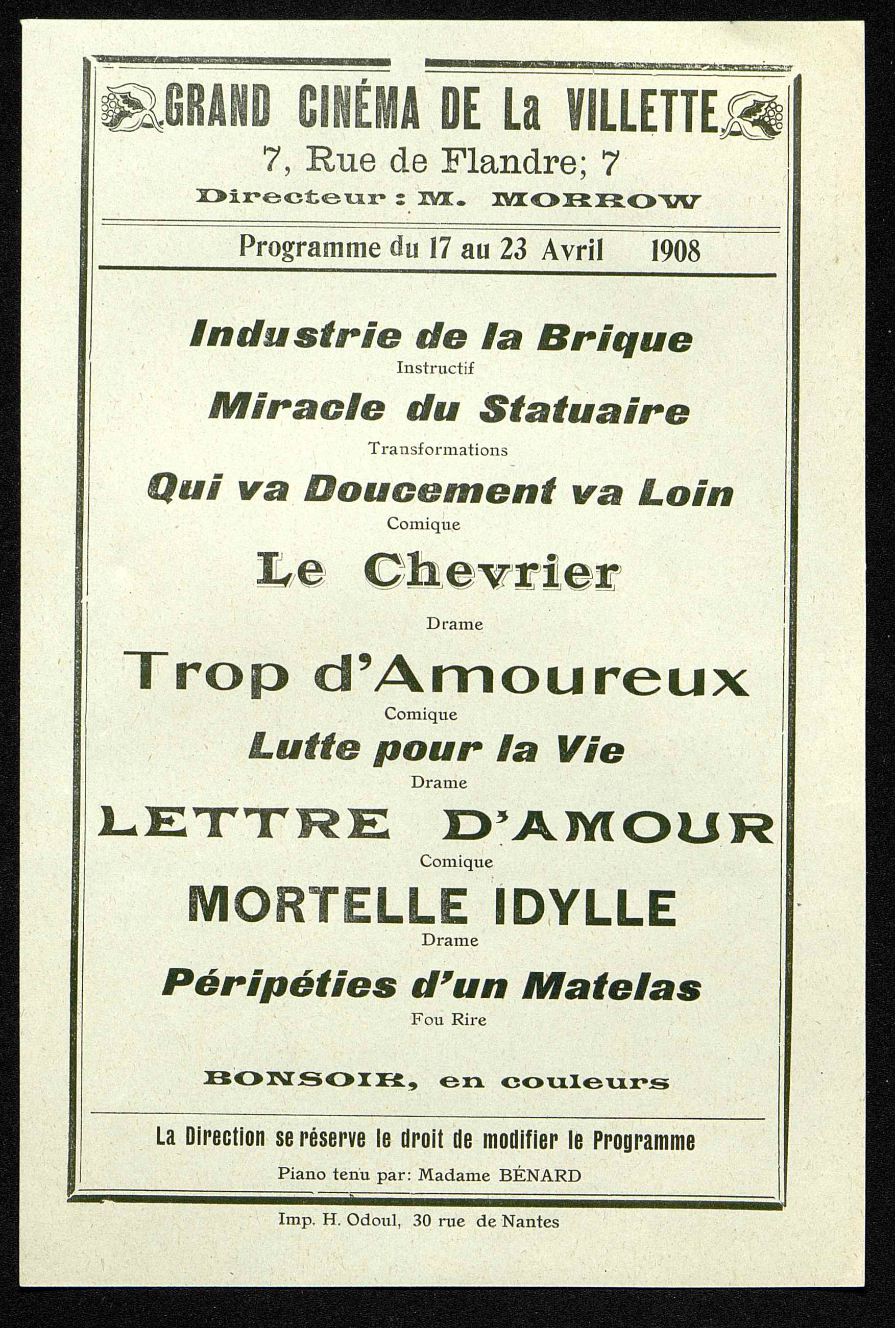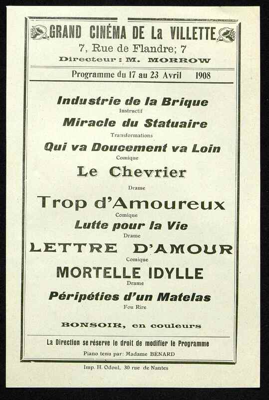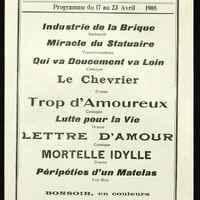 Programme : Industrie de la brique. Miracle du statuaire. Qui va doucement va loin. Le Chevrier. Trop d'amoureux. Lutte pour la vie. Lettre d'amour. Mortelle idylle. Péripéties d'un matelas. Bonsoir, en couleur.