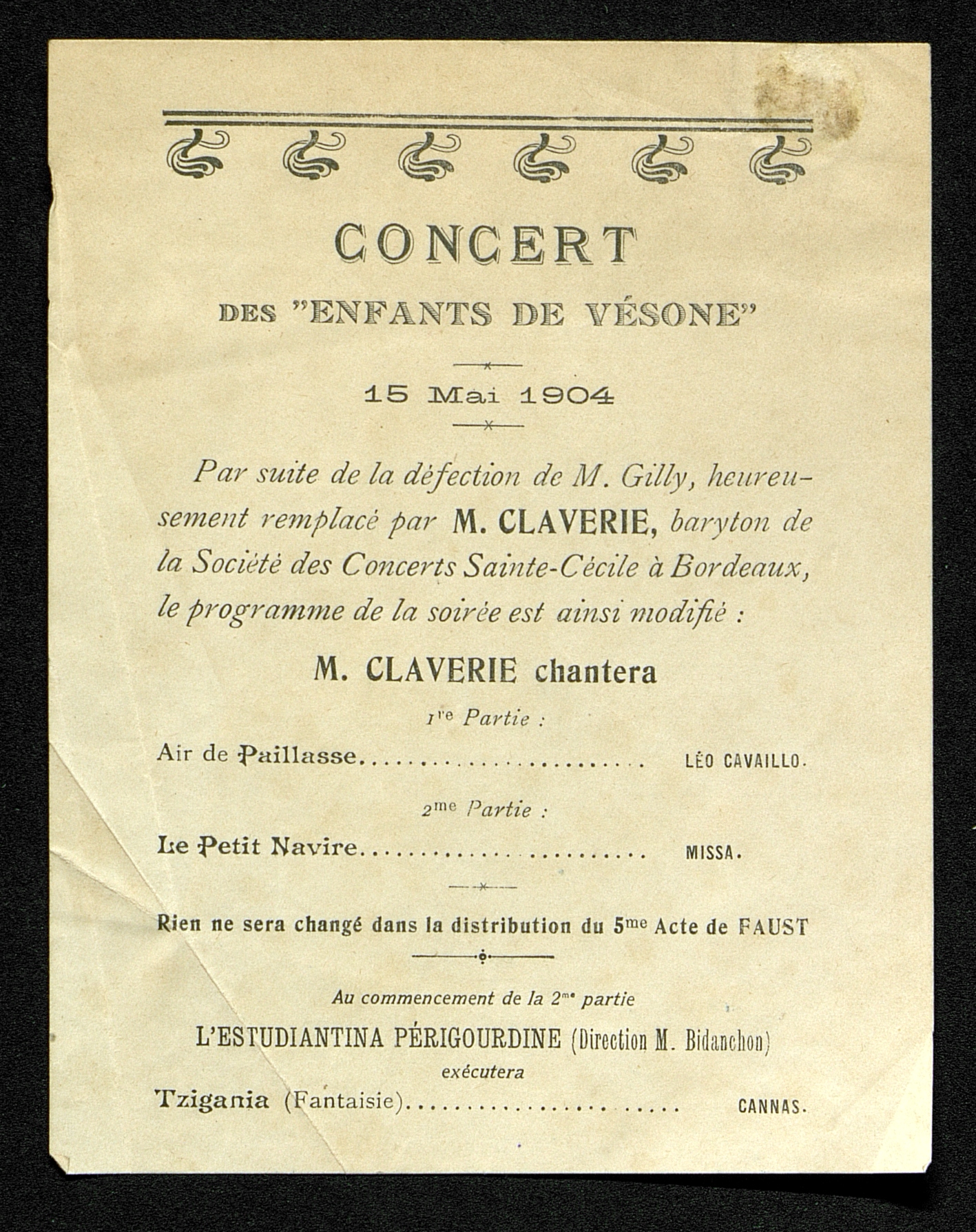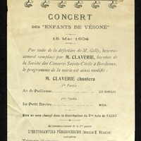 Programme de concert des Enfants de Vésone ; Air de Paillasse de Leo Cavaillo, Le petit navire de Missa, Acte 5 du Faust de Gounod, Tzigania : Fantaisie de Cannas