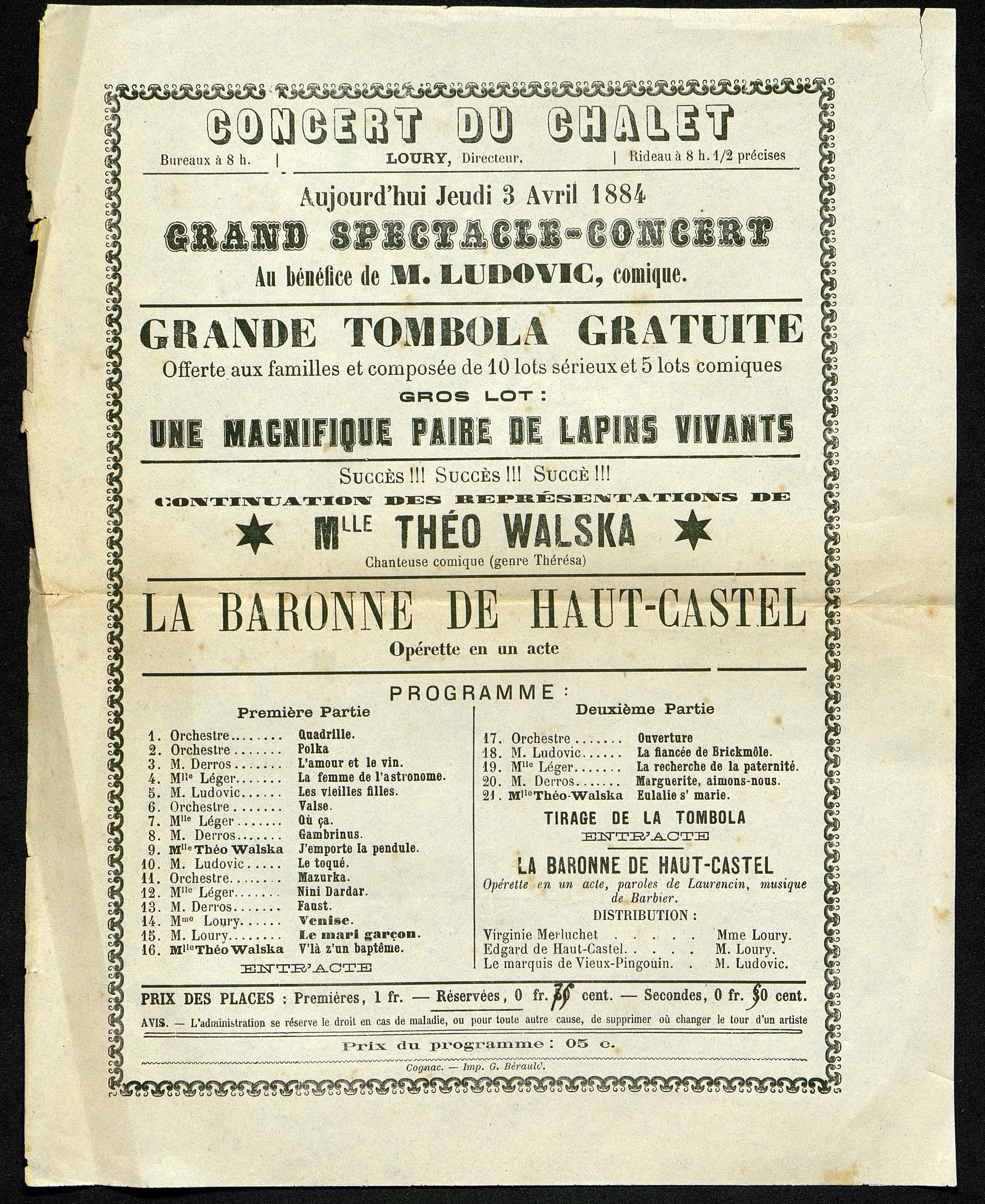Programme de concert du chalet du jeudi 3 avril 1884 à Cognac de l'opérette en un acte "La Baronne de Haut-castel"