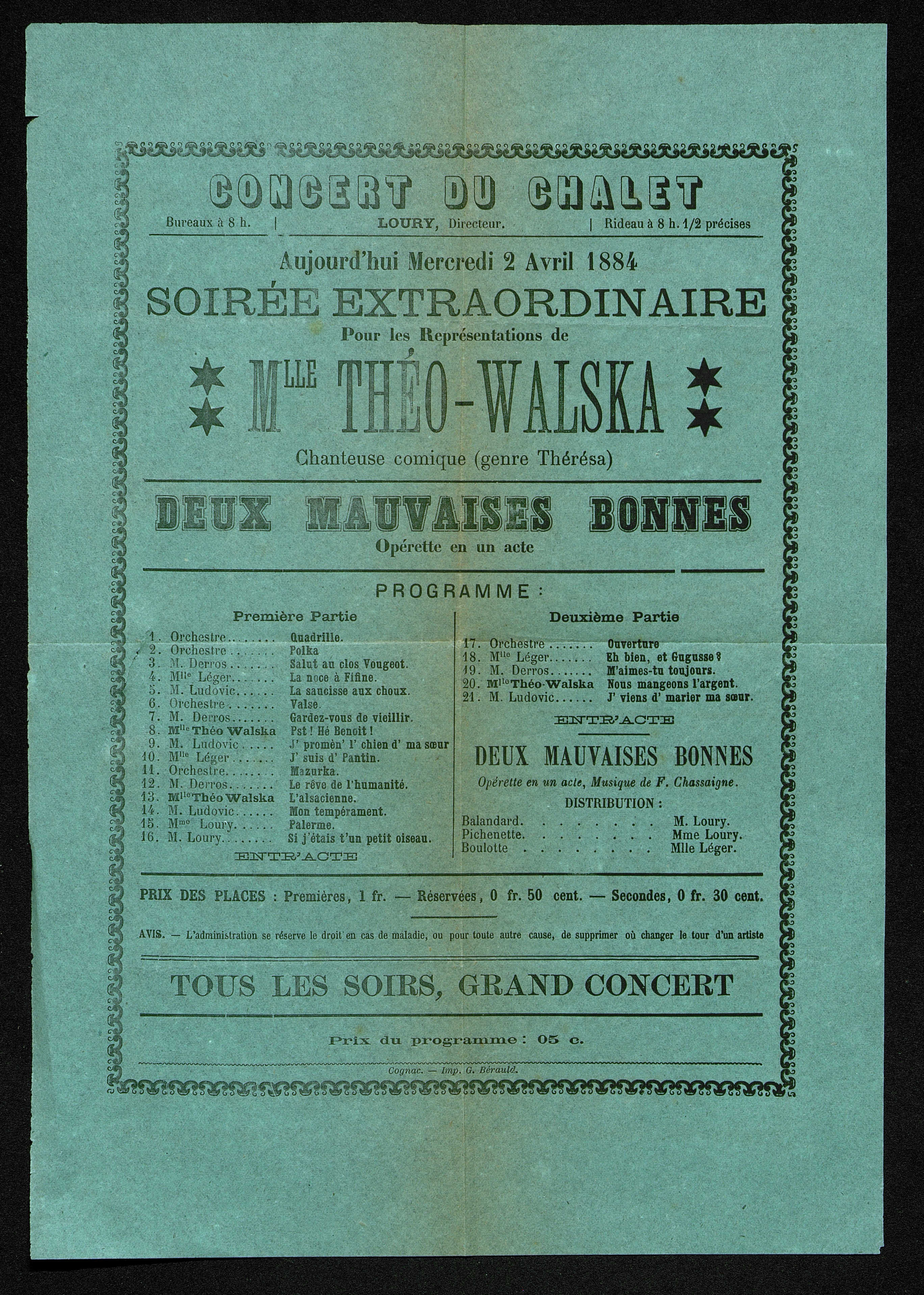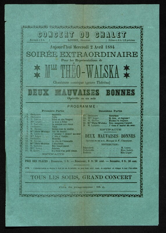 Représentation au Chalet le mercredi 2 avril 1884 de l'opérette "Deux mauvaises bonnes"