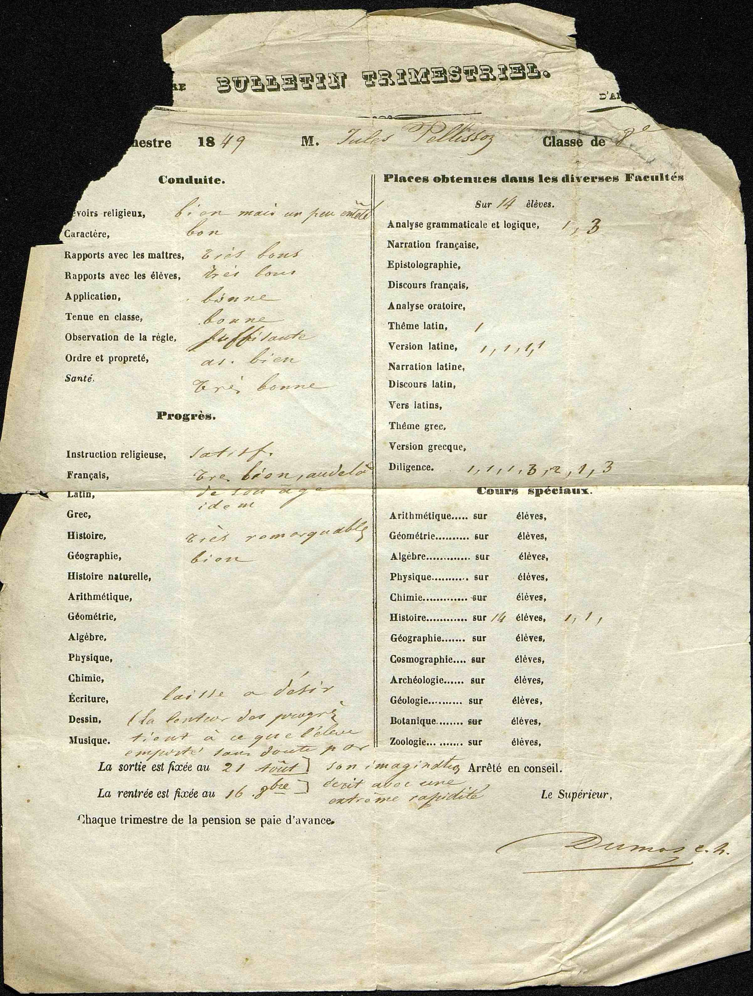 Bulletin du [3e] trimestre 1849 de M. Jules Pellisson Classe de 2e [au petit séminaire N.D. de Richemont du château de Richemont du diocèse d'Angoulême à Cherves-Richemont]. Document très altéré.