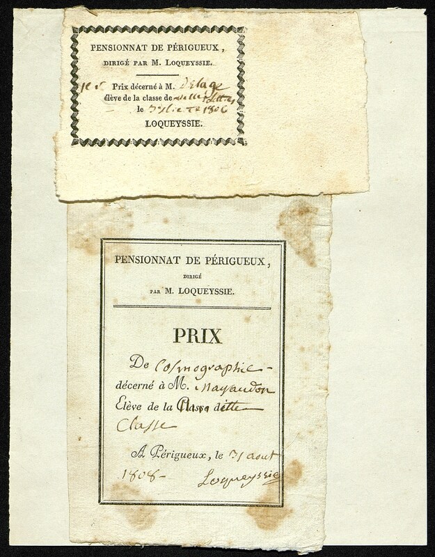 Deuxième billet du pensionnat de Périgueux dirigé par M. Loqueyssie. Prix de cosmographie décerné à M. Naygaudon