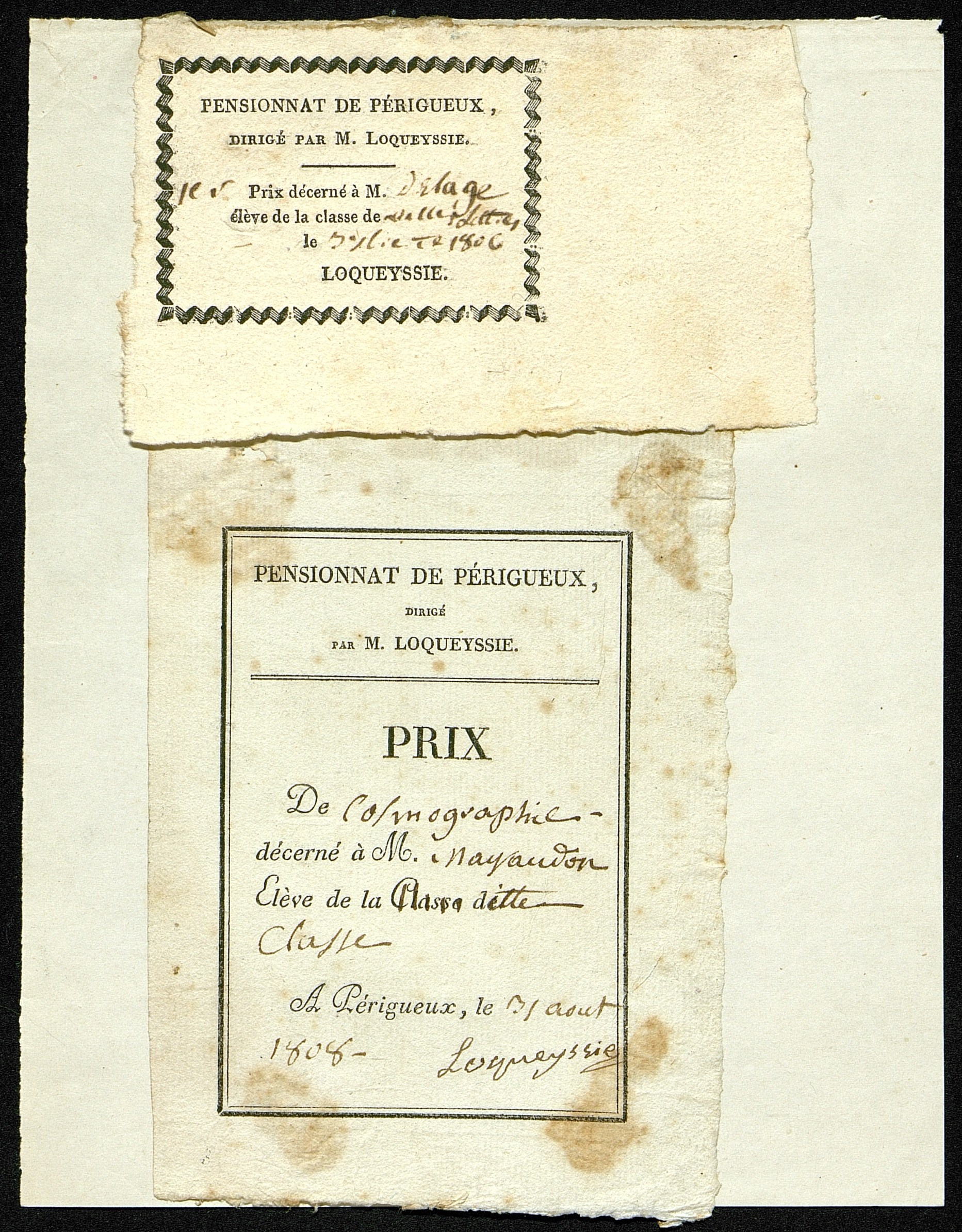 Deux billets de prix pour deux pensionnaires à Périgueux en 1806 et 1808
