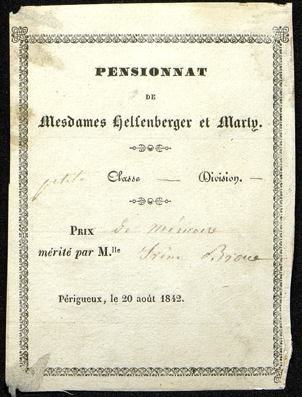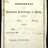 Billet de Prix de Mémoire du Pensionnat de Mesdames Helfenberger et Marty petite classe mérité par Mlle Irène Broue