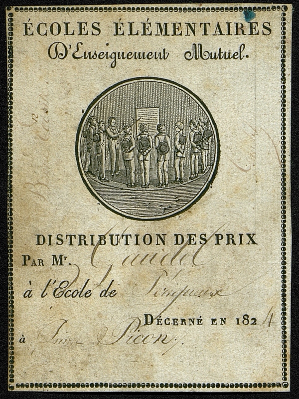 Billet de prix des Ecoles élémentaires d'enseignement mutuel en 1824